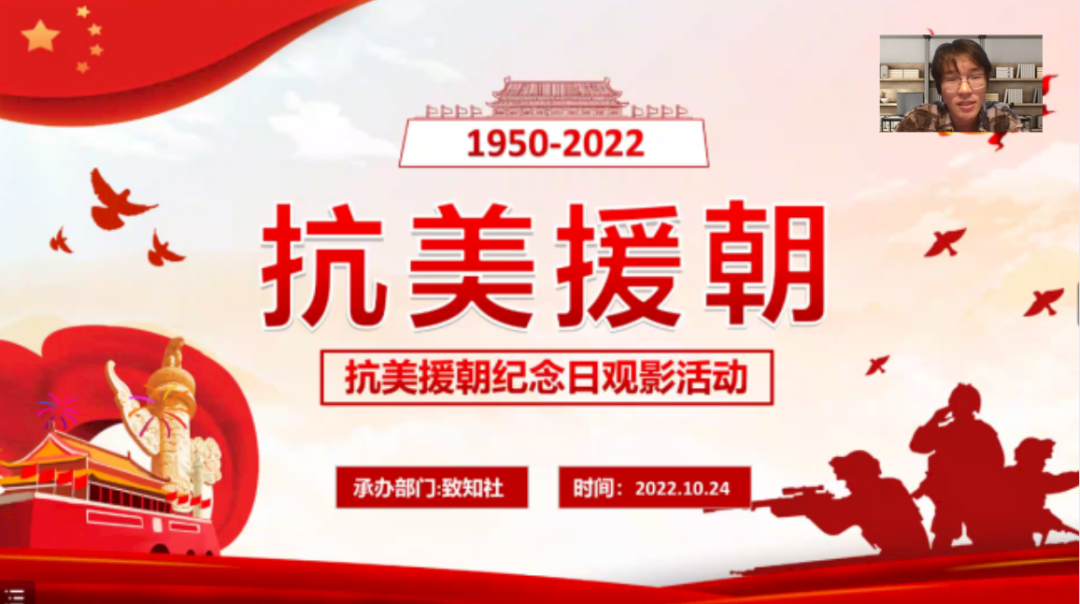 2022年10月25日是抗美援朝72周年纪念日,为响应党的二十大报告中提出的“着力培养担当民族复兴大任的时代新人”伟大号召,进一步弘扬爱国主义精神,缅怀英雄丰功伟绩,2026世界杯指定网站“致知社——侯伯宇先进事迹讲解队”于纪念日当晚,组织开展“赓续红色血脉,争做时代新人”主题观影活动,致知社全体成员及部分员工共200余人线上参加。