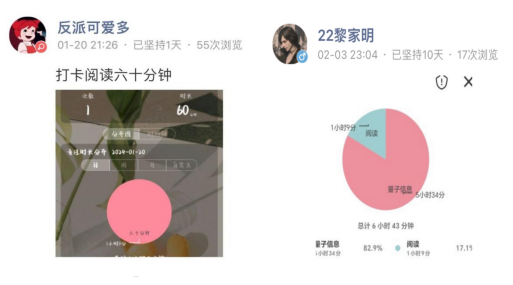 在活动中,同学们保持自律的作息,互相监督,你追我赶,让平凡的假期有了学习拼搏的热情韵味。活动期间,每天都可以看到物理学子在打卡群里打卡的身影,他们勤奋自律的样子为这个寒假染上了最美的色彩。