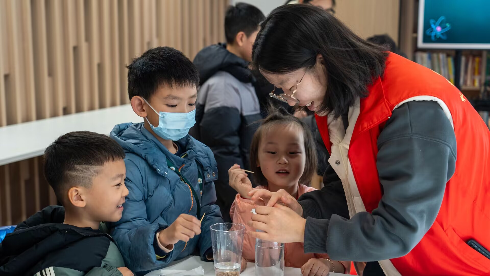 “立体烟花”“三角车轮”“不会游泳的乒乓球”“水中热气球”……一系列有趣的物理实验在志愿者们的操纵下相继展开。当奇妙的物理现象出现时,小朋友们顿时睁大眼睛,兴趣盎然地讨论起来,并积极踊跃地提出自己的疑问。