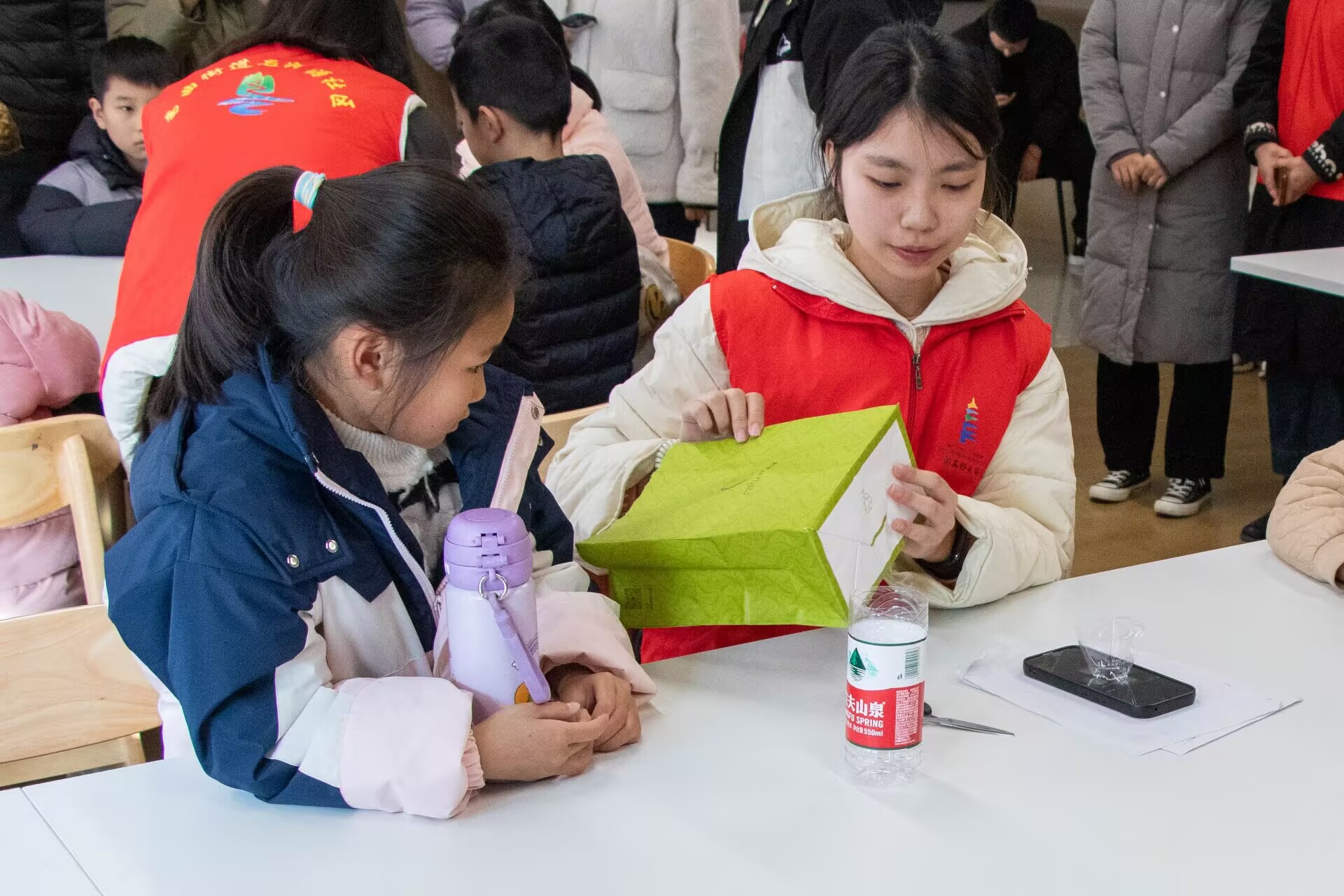 当讲解告一段落,志愿者们便鼓励小朋友们亲自动手实践。孩子们纷纷化身为“小小实验家”,在实验过程中活力满满,即使会遇到小小的失败,但在及时的帮助和调整下,他们最终克服困难成功实验。在此过程中他们不仅感到了喜悦和自豪,而且更进一步感受到了物理实验的魅力。