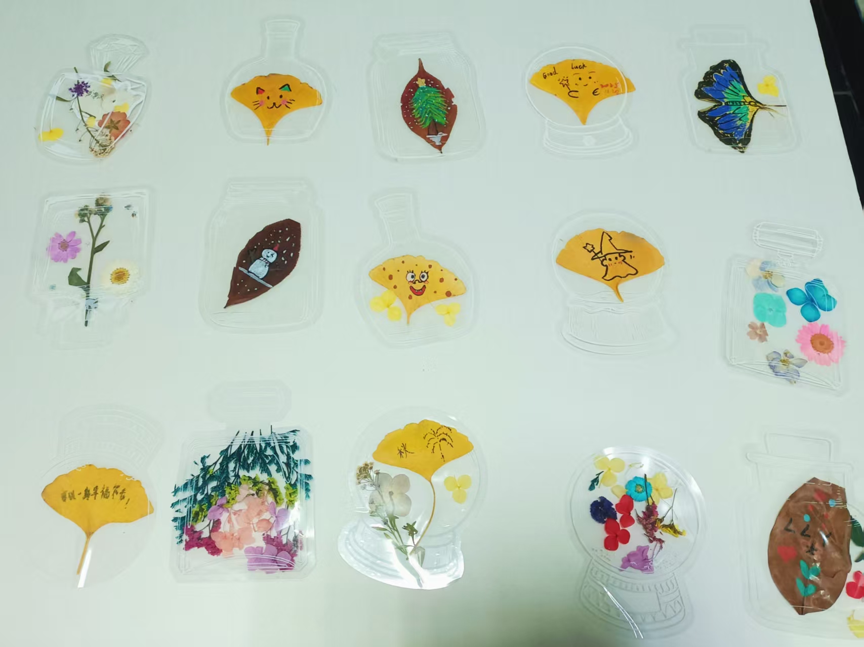 活动伊始,工作人员结合实物演示,详细讲解了秋叶压花与手绘创意两种书签制作技法。在秋叶压花环节,同学们精心挑选干花与落叶,通过构思、拼贴、覆膜等步骤,将银杏、花瓣等自然元素定格为独具秋意的书签作品。手绘环节则充分展现了同学们的个性与创意,不少同学将烧瓶、电路等物理符号与诗句、星辰等意象结合,绘出科学与艺术交融的独特设计。