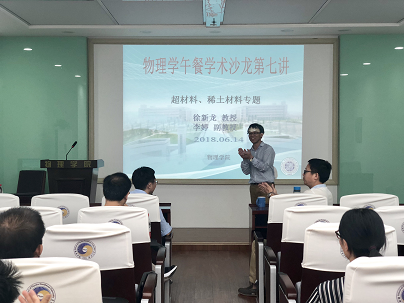 物理学午餐学术沙龙第七讲-- 超材料 、稀土材料专题,于6月14日(周四)中午12:30在劼恒多媒体教室成功举办,主讲人为徐新龙教授和李婷副教授。沙龙由经光银教授主持,物理学科师生40余人参加了本次活动。
