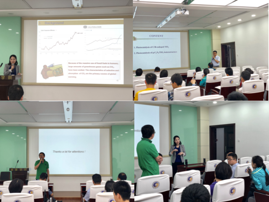 林彦明副教授以能源危机这一现象开场,引出新能源开发利用的重要性。并指出二氧化钛(TiO2) 半导体材料在太阳光的照射下能发生光催化分解水产生氢气和氧气,那么TiO2 及其某些低维半导体纳米材料的光催化就成为解决能源危机的理想途径。报告中,着重介绍了利用第一性原理计算方法研究 TiO2 及其某些低维半导体纳米材料相关的光催化机理,并向与会师生给出了相关理论结果以及该领域的发展动向。