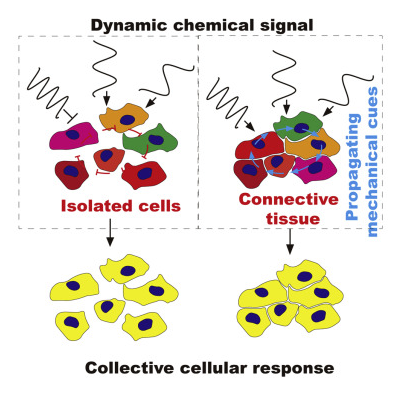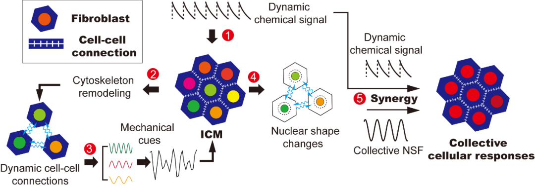 课题组成员进一步将单个细胞从拥挤环境中分离出来,并人工导入与细胞单层中类似的力学信号,发现环境中化学信号与力学信号的协同作用是集群应答行为产生的关键因素。研究结果表明生物组织具备将化学环境信号转化为动态力学信号的能力,这种能力对于调控生物组织中群体细胞的集群应答行为至关重要。