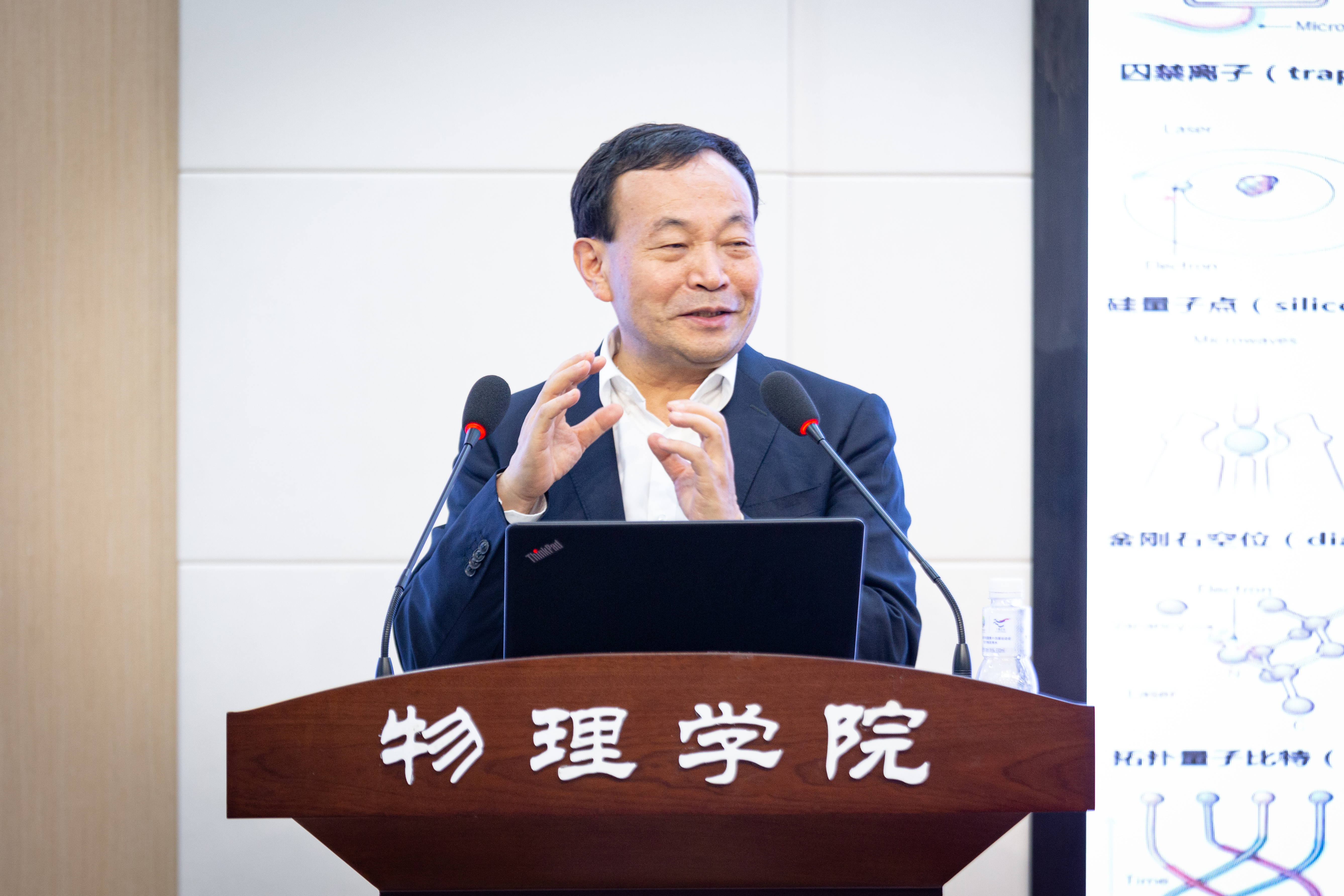报告中,俞大鹏院士首先介绍了量子科学发展史及发展现状,“量子是指组成我们宏观世界的微观粒子处于能量不连续的量子态:量子态之间能量的交换是一份份进行的,量子是最小能量单位”。随后,俞大鹏院士向大家阐述了量子技术对工业革命的重要性以及现阶段量子技术发展的内外忧患,紧接着他向师生们介绍了其研究团队在深圳开展的系列工作及成果。最后,俞大鹏院士陈述了自己对科技自主之路的思考与建议。
