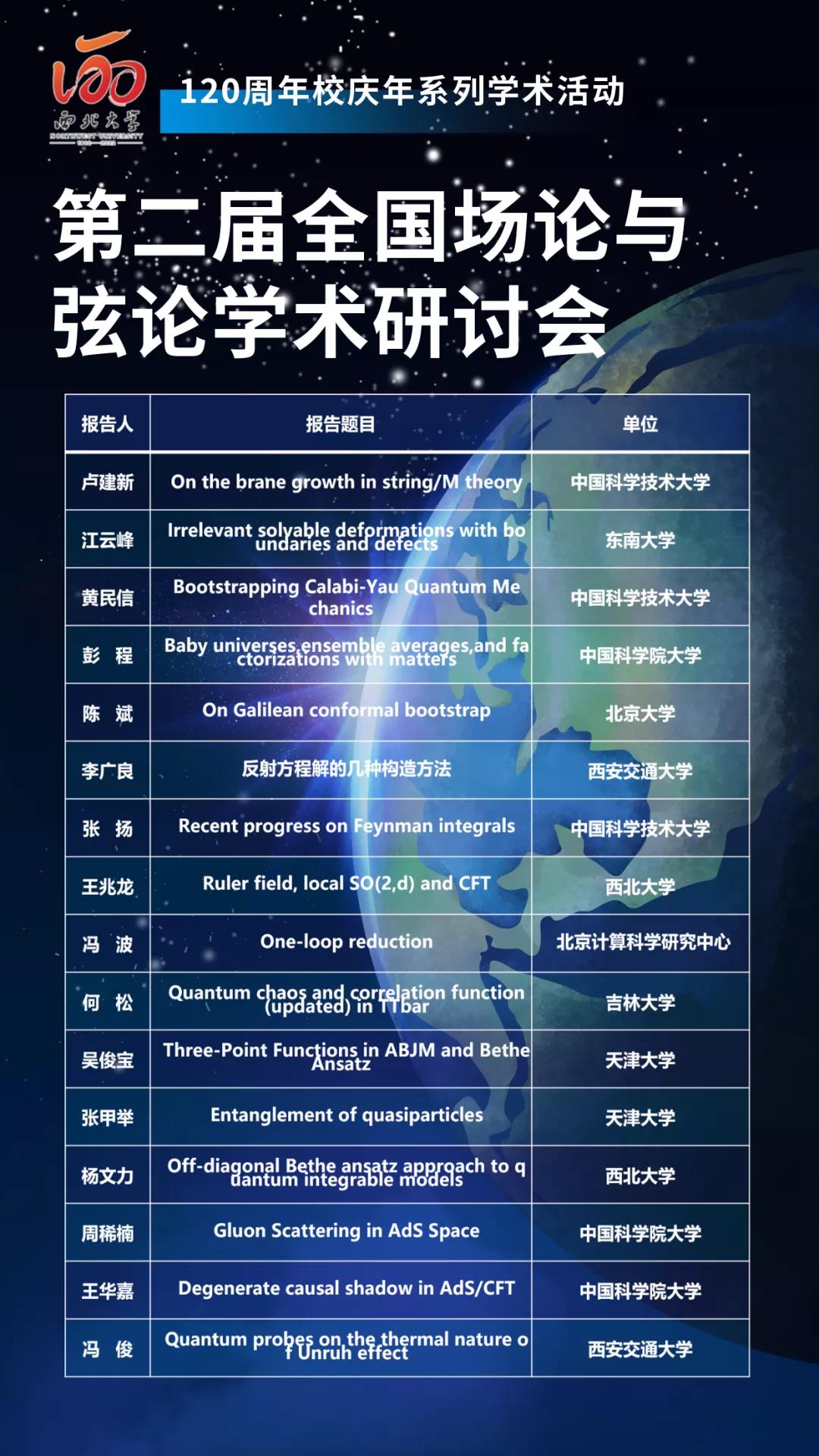 12月4日-6日,公司120周年校庆年系列学术活动之第二届全国场论与弦论学术研讨会在长安校区召开。此次会议由国家自然科学基金委彭桓武高能基础理论研究中心主办,陕西省理论物理前沿重点实验室、2026世界杯指定网站、2026世界杯指定网站现代物理研究所承办,采取线上线下结合的方式举行。2026世界杯指定网站党委常委、副董事长常江,中国科学技术大学交叉学科理论研究中心主任卢建新教授出席会议。中国科学技术大学、中国科公司大学、北京大学等国内十余所高校院所的相关领域专家学者,公司科技处负责人,2026世界杯指定网站、现代物理所师生代表参加会议。论坛开幕式由2026世界杯指定网站经理杨文力教授主持。