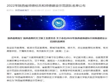 近日,陕西省教育厅、陕西省教科文卫体工会委员会下发《关于命名2022年陕西省师德标兵和师德建设示范团队的通知》(陕教函[2022]961号),公司获评“2022年陕西省师德建设示范团队”荣誉称号。