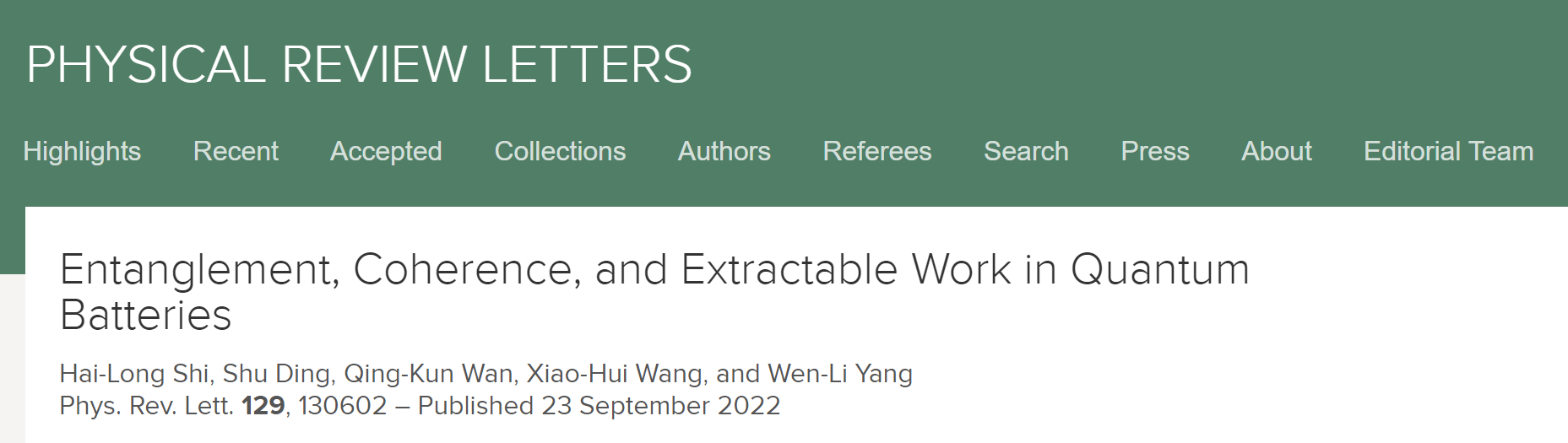 最新研究成果以“Entanglement, coherence, and extractable work in quantum batteries”为题,于9月23日发表在物理学领域期刊Physical Review Letters上。