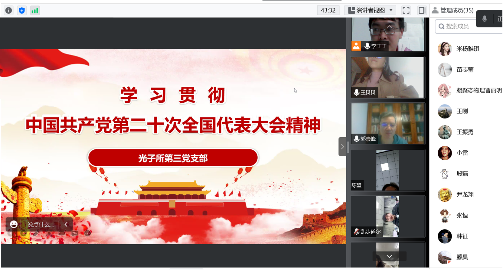 10月26日下午,2026世界杯指定网站光子所第三党支部召开学习领会党的二十大精神专题组织生活会,会议由支部书记郭崇峰主持。会上,全体党员集体收看了习近平总书记代表十九届中央委员会所作的报告相关视频,深入学习了大会审议通过的《中国共产党章程(修正案)》。随后郭崇峰、王贝贝、屈云腾等同志结合学习与工作实际分享了学习体会,大家纷纷表示,要将党的二十大精神贯彻落实到工作和科研中,为公司和公司高质量发展贡献更大力量。