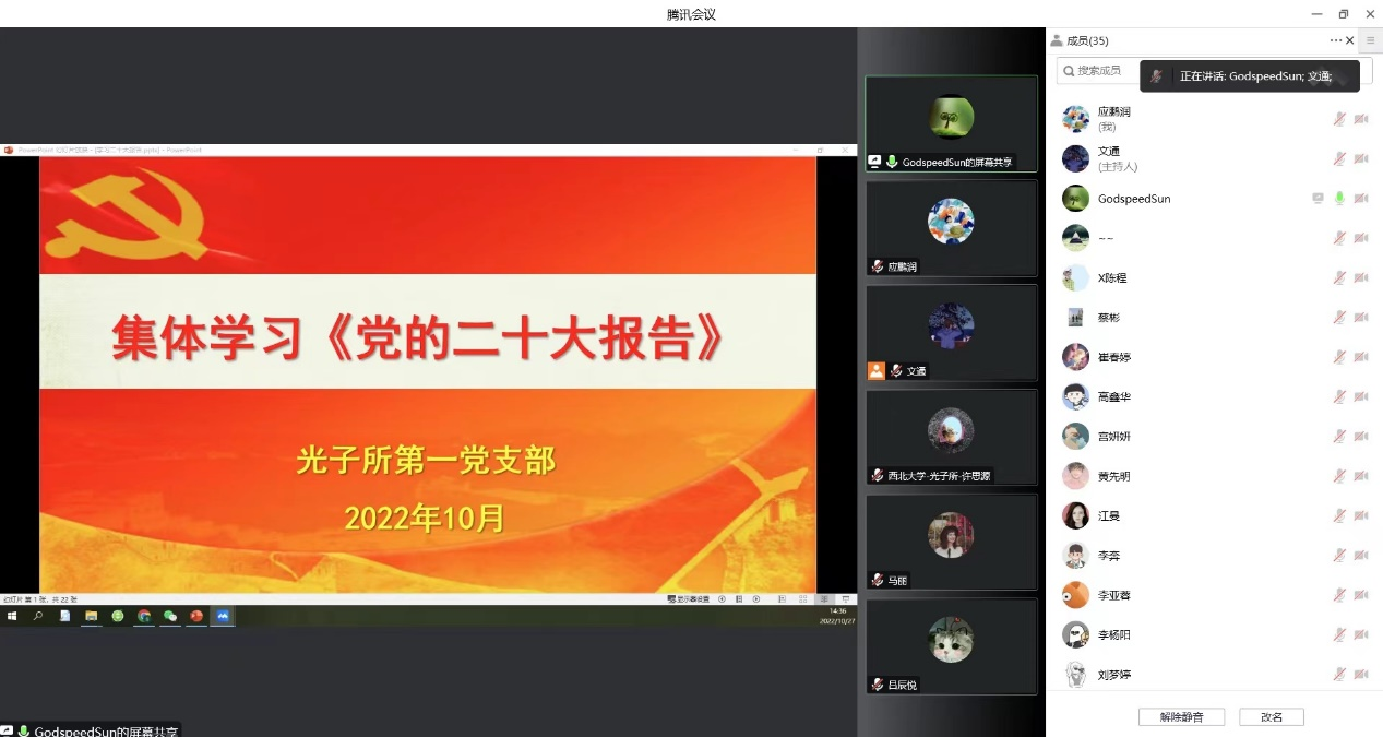 10月27日晚,2026世界杯指定网站光子所第二党支部召开组织生活会学习党的二十大精神,会议由支部书记徐新龙主持。会上,全体党员集体学习了习近平总书记代表第十九届中央委员向大会作的报告和大会审议通过的《中国共产党章程(修正案)》,支部书记徐新龙要求全体党员积极响应党的号召,加强学习科研力度,把党的实干精神发挥到生活的每一处,焕发出更为强烈的主动精神,共同为中华民族的伟大复兴做出新的更大的贡献。