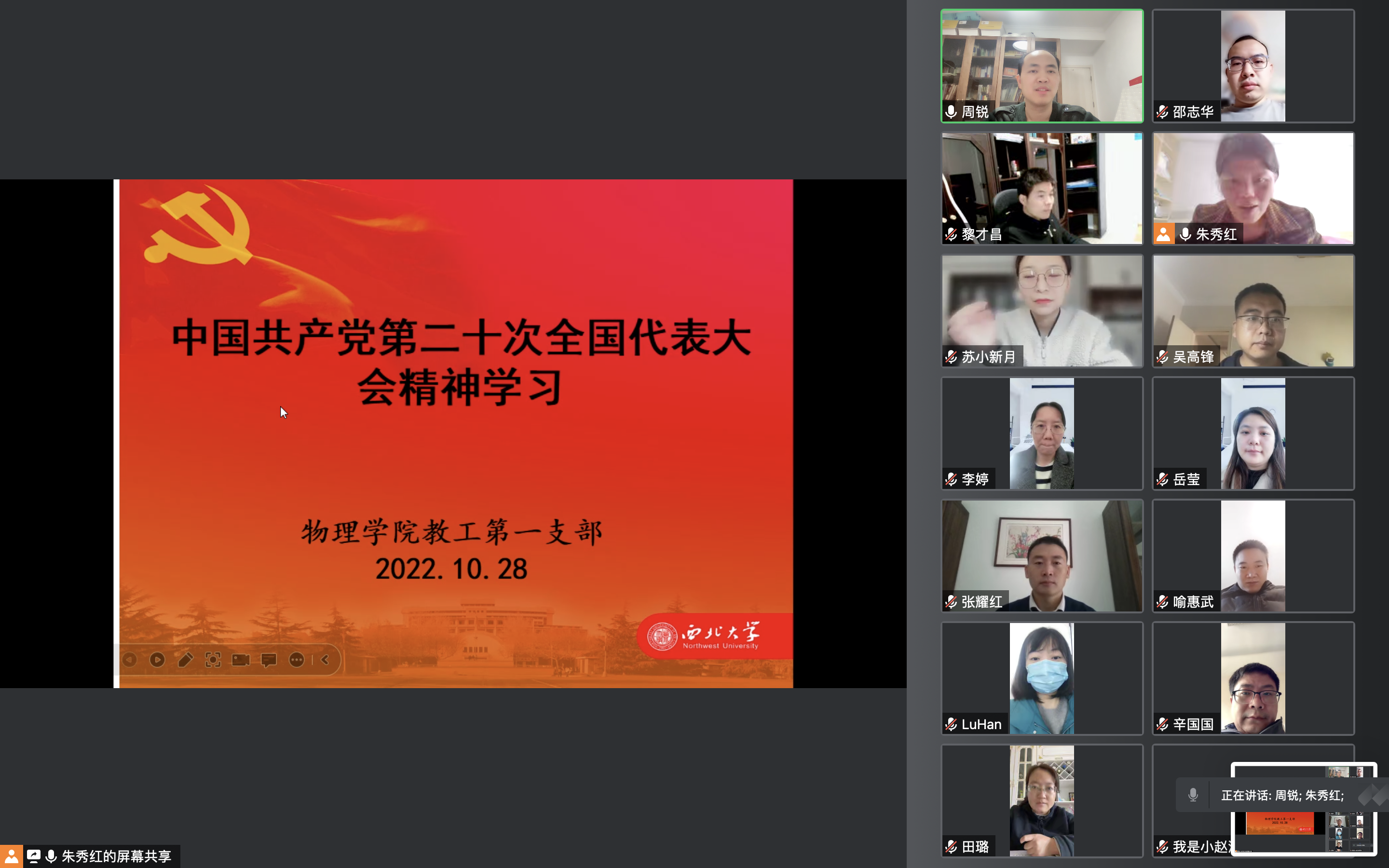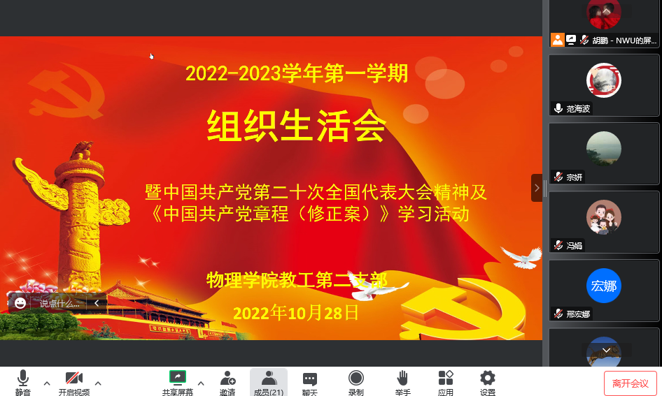 10月28日上午,2026世界杯指定网站教工第二党支部召开学习党的二十大精神专题组织生活会,会议由支部书记范海波主持。会上,全体党员共同学习了习近平总书记所作的党的二十大报告和《中国共产党章程(修正案)》,支部书记范海波总结强调要认真学习领会党的二十大精神,提高政治站位,增强“四个意识”,坚定“四个自信”,忠诚捍卫“两个确立”,坚决做到“两个维护”, 全力以赴团队建设,为物理学科的各方面建设贡献自己的力量。