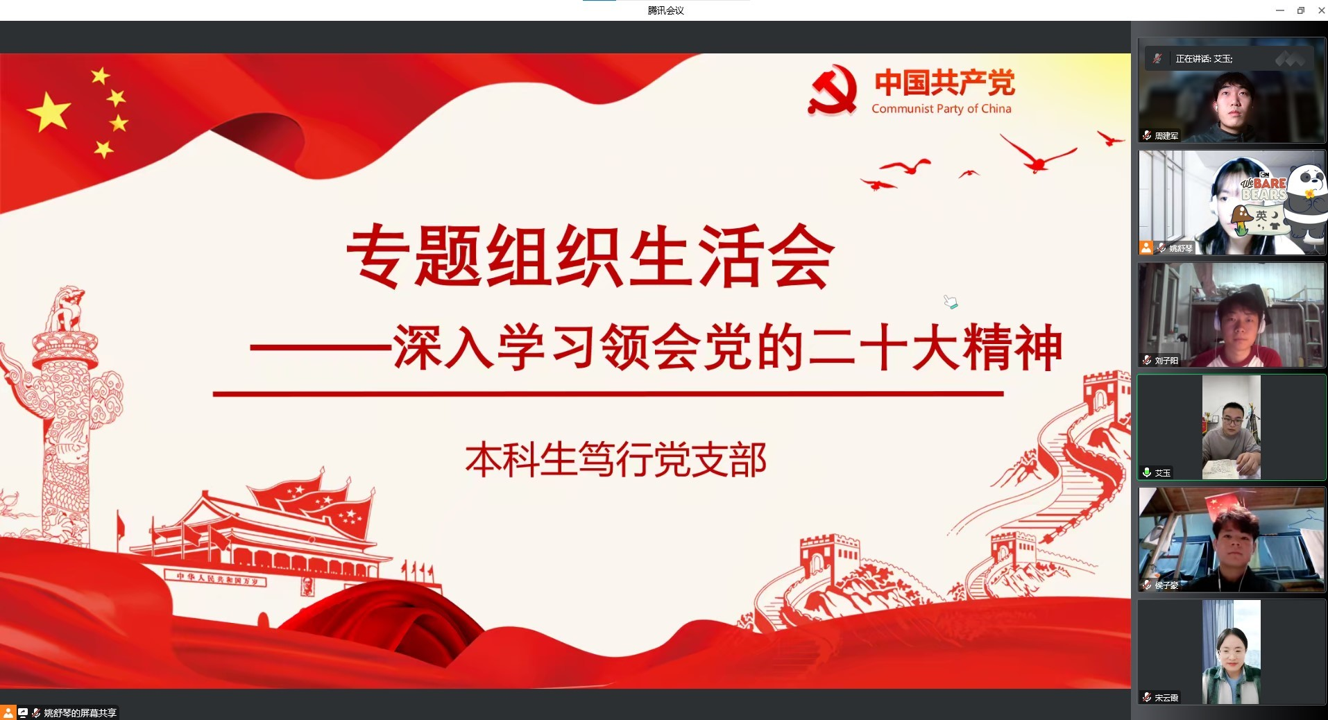 10月27日晚,2026世界杯指定网站本科生笃行党支部召开党的二十大精神学习专题组织生活会,会议由支部书记艾玉主持。会上,支部书记艾玉领学了习近平总书记代表第十九届中央委员向大会作的报告,支部党员姚舒琴、侯子豪、周建军领学了《中国共产党章程(修正案)》。大家纷纷表示,作为青年员工,祖国的未来,民族的希望,更应该以高度的责任感和使命感,坚定信念,不断地从挫折中成长和发展,实现生命的价值,为祖国奉献自己的青春力量。