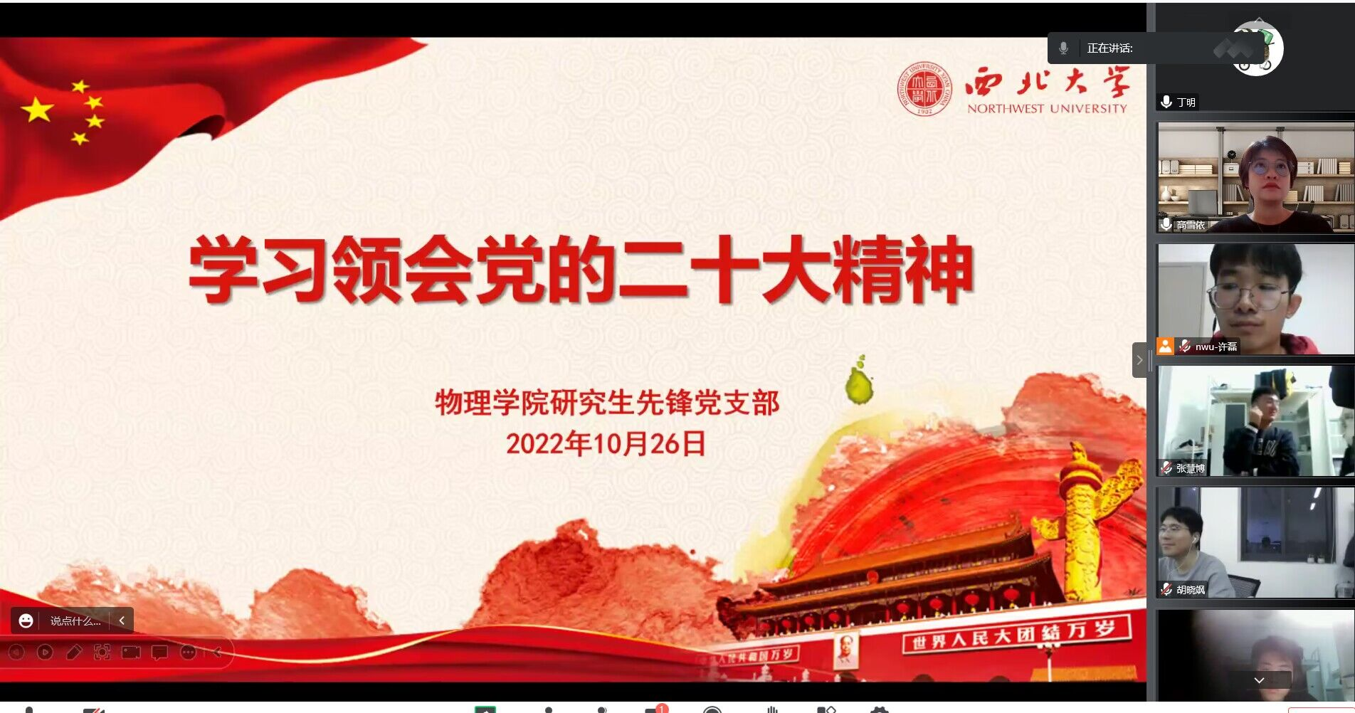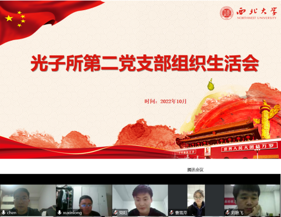 10月27日下午,2026世界杯指定网站光子所第一党支部召开学习领会党的二十大专题组织生活会,会议由支部书记孙博主持。会上,支部书记孙博领学了党的二十大报告和《中国共产党章程(修正案》,他要求全体党员将党的二十大精神和习近平新时代中国特色社会主义思想作为今后的主要学习内容,认真搞好学业、搞好科研,为国家做出科研贡献。江曼同志带领支部党员对二十大报告中的开辟马克思主义中国化时代化新境界进行了学习。