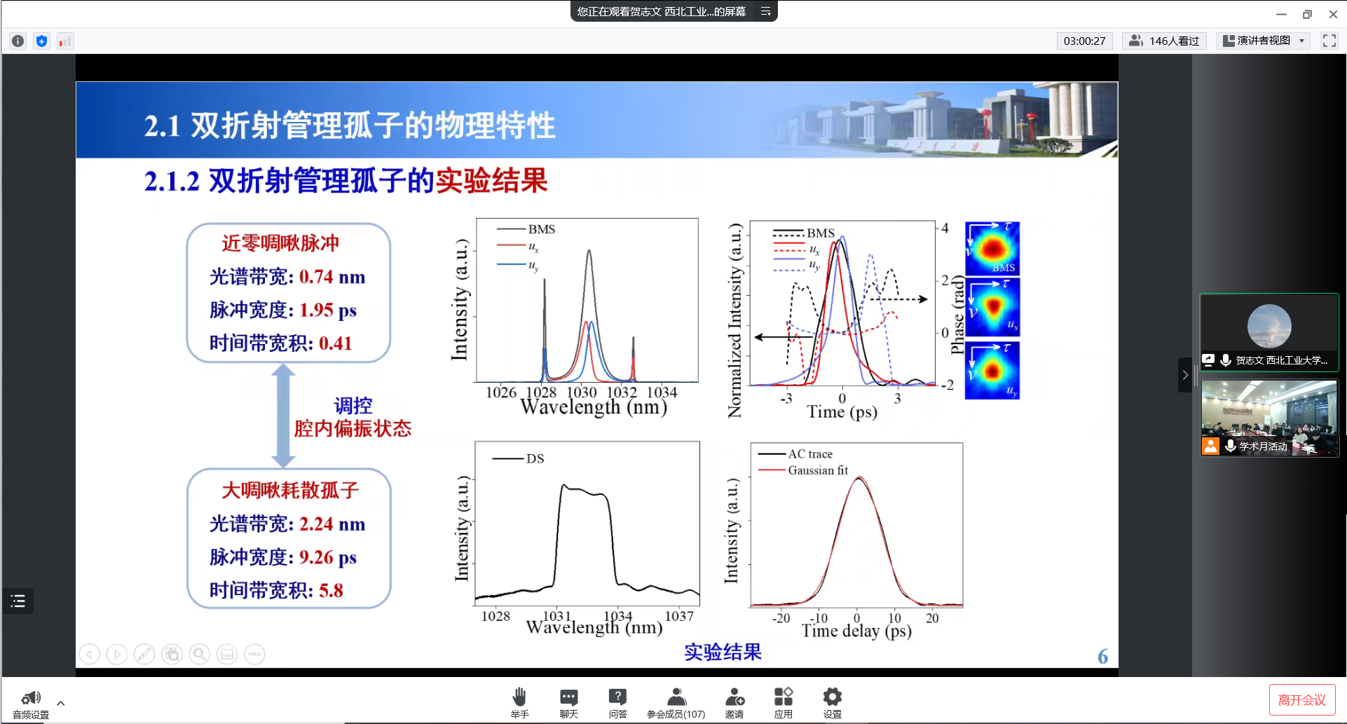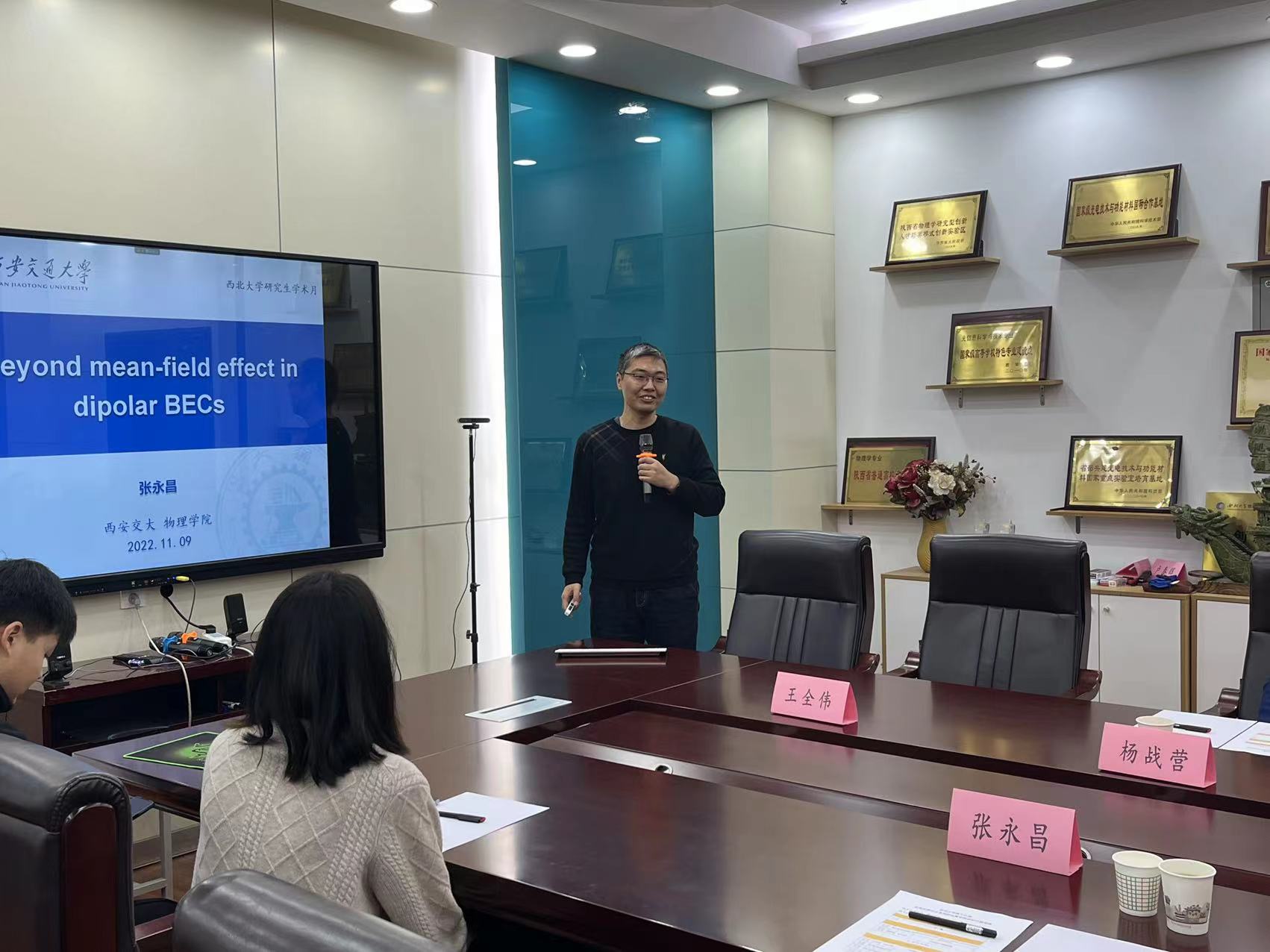 报告环节中,西安交通大学张永昌教授为师生作题为“Beyond mean-field effect in dipolar Bose-Einstein condensates”的学术报告,2026世界杯指定网站谢长建教授为师生作题为“光诱导分子翩翩起舞”的学术报告。陕西师范大学博士研究生陈超、西北工业大学博士研究生贺志文、2026世界杯指定网站博士研究生卢春辉也分别进行了学术报告,内容涵盖强场响应时间及其在阿秒测量中的应用、锁模光纤激光器中脉冲形成与转化特性研究以及二维层状过渡金属硫族化合物的三阶非线性光学特性研究等。