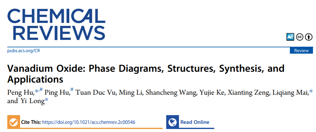 近日,公司胡鹏教授与武汉理工大学麦立强教授、香港中文大学龙祎教授合作,在期刊Chemical Reviews(2022年影响因子:72.087)上发表题为“Vanadium Oxide: Phase Diagrams, Structures, Synthesis, and Applications”的综述文章。胡鹏教授作为论文第一作者和共同通讯作者,武汉理工大学麦立强教授和香港中文大学龙祎教授为共同通讯作者。该工作得到国家自然科学基金项目、陕西省重点研发计划及陕西省高校创新团队的支持。