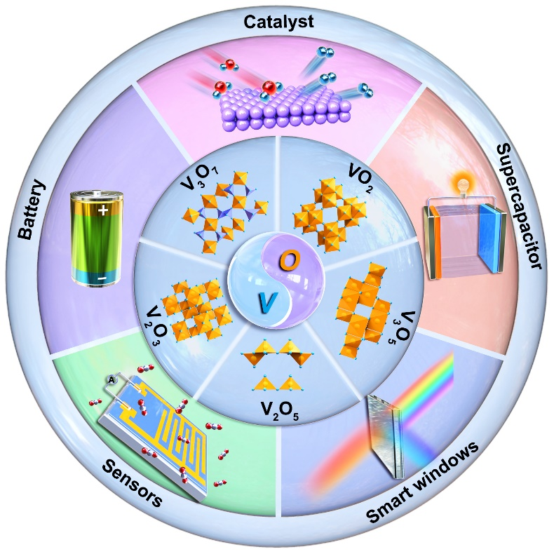具有多种氧化态和各种晶体结构的钒氧化物具有独特的电学、光学、光电和磁学性质,从而可以应用于多个领域。在过去的30年里,人们开展了钒氧化物的基础研究并探索了钒氧化物材料在离子电池、水分解、智能窗户、超级电容器、传感器等方面的潜力。尽管前期人们在钒氧化物的合成(水热、化学气相输运、原子层沉积)、性质(金属绝缘体相变、拉曼)、应用(催化、电池、传感、超级电容器)等方面进行过综述,并且课题组也对钒氧化物的多刺激响应性质和能源方面应用做过综述(Appl. Energy 2018, 211, 200;Small 2018, 14, 1802025;Adv. Energy Mater. 2019, 9, 1902066;Mater. Horizons 2019, 6, 1380),但是这些综述都是聚焦于某一种具体的钒氧化物或者某一具体应用方向,具有不同应用的不同钒氧化物的全面综述还未见报道。