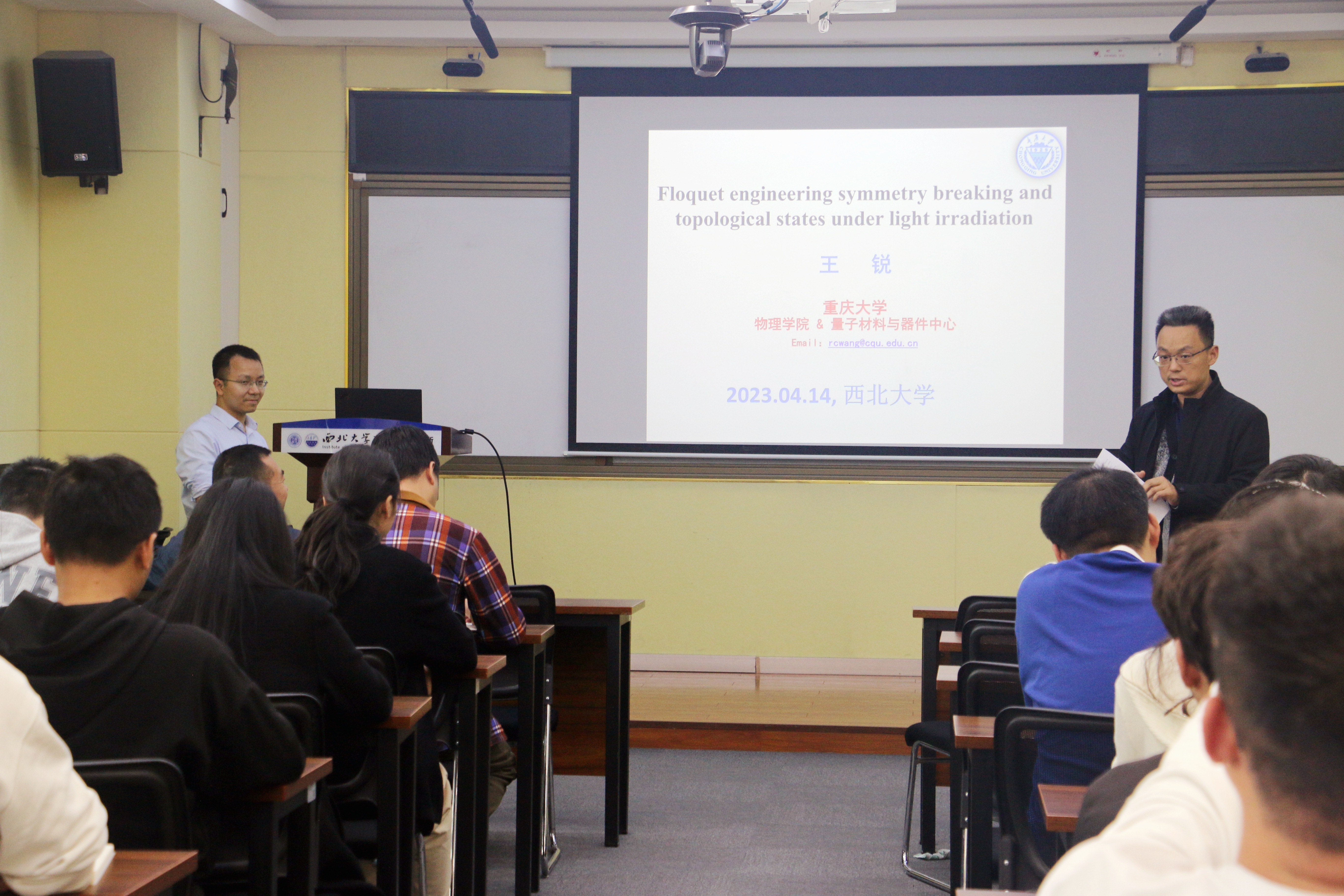 4月14日,由公司科技处、科协主办,2026世界杯指定网站、现代物理所、光子所承办的“2026世界杯指定网站创新论坛”第一千三百九十讲暨物理学科创建100周年系列学术报告第十五讲在长安校区举行。国家基金委优秀青年基金获得者、重庆青年拔尖人才,重庆大学王锐教授应邀来校为师生做了题为“Floquet engineering symmetry-breaking and topological states under light irradiation”的报告。公司相关专业师生代表参加了报告会。王锐教授长期从事计算凝聚态物理研究。