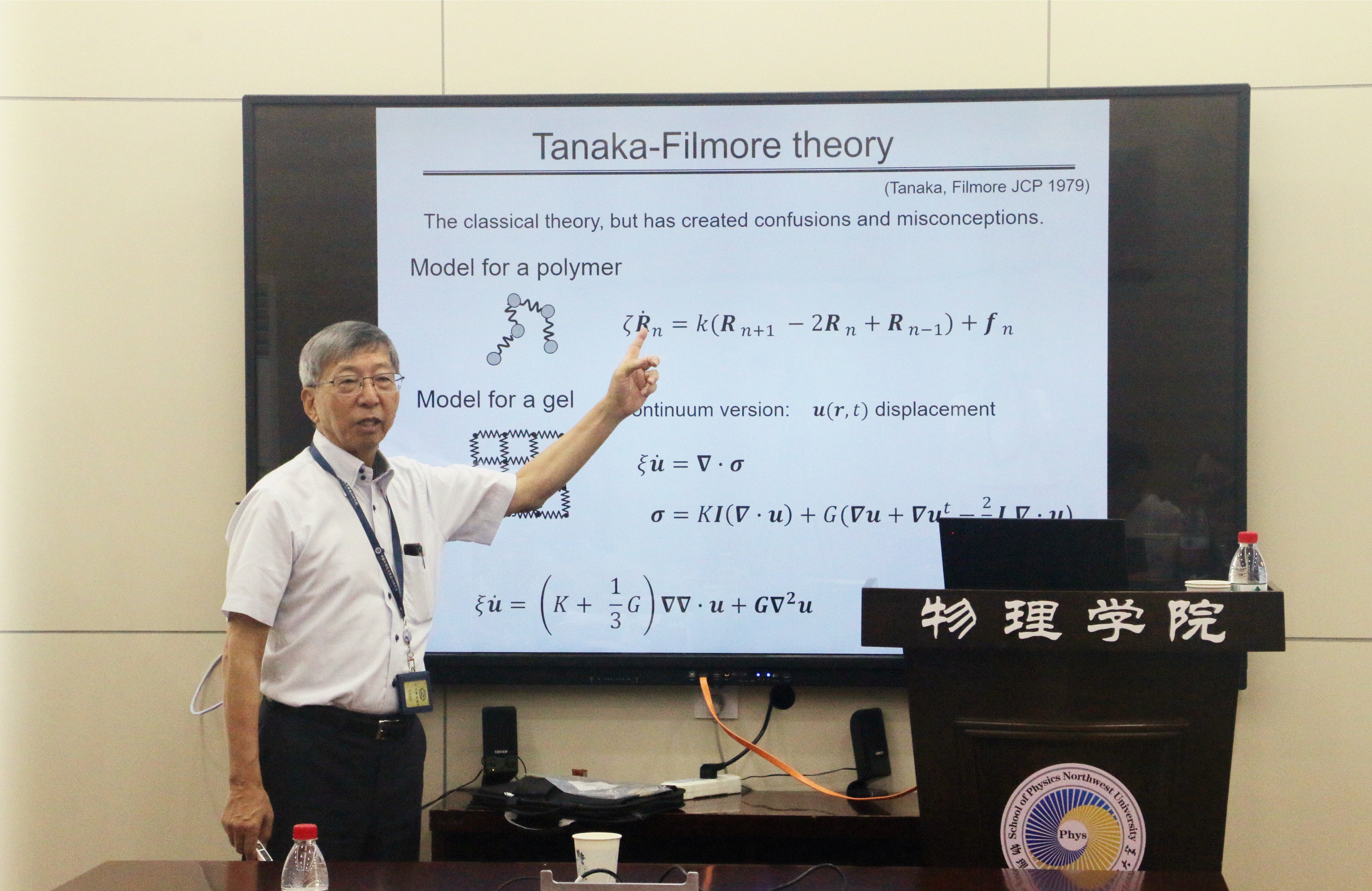 软物质物理是研究易形变和流动性物质的交叉学科分支,涉及凝胶、液晶、胶体、凝胶、软体物质与材料等。Masao Doi院士从日常生活最简单“水宝宝”现象说起,首先介绍了扩散现象的概念即溶剂中的凝胶会膨胀并吸收其周围溶剂。随后,Masao Doi院士讨论了如何处理凝胶和塑料中的扩散-机械耦合问题,以及如何更好应对该现象。他指出,聚合物分子会扩散进入溶剂,同时溶剂分子也会扩散进入聚合物网络,凝胶中的扩散过程通常伴随着聚合物网络的变形,与网络的弹性耦合在一起。在聚合物的液态(如聚合物熔体和溶液)中,因为聚合物分子通过纠缠形成了临时的网络结构,所以同样存在类似的扩散-机械耦合现象;在塑料中,塑化剂的扩散也会影响塑料的流变特性。