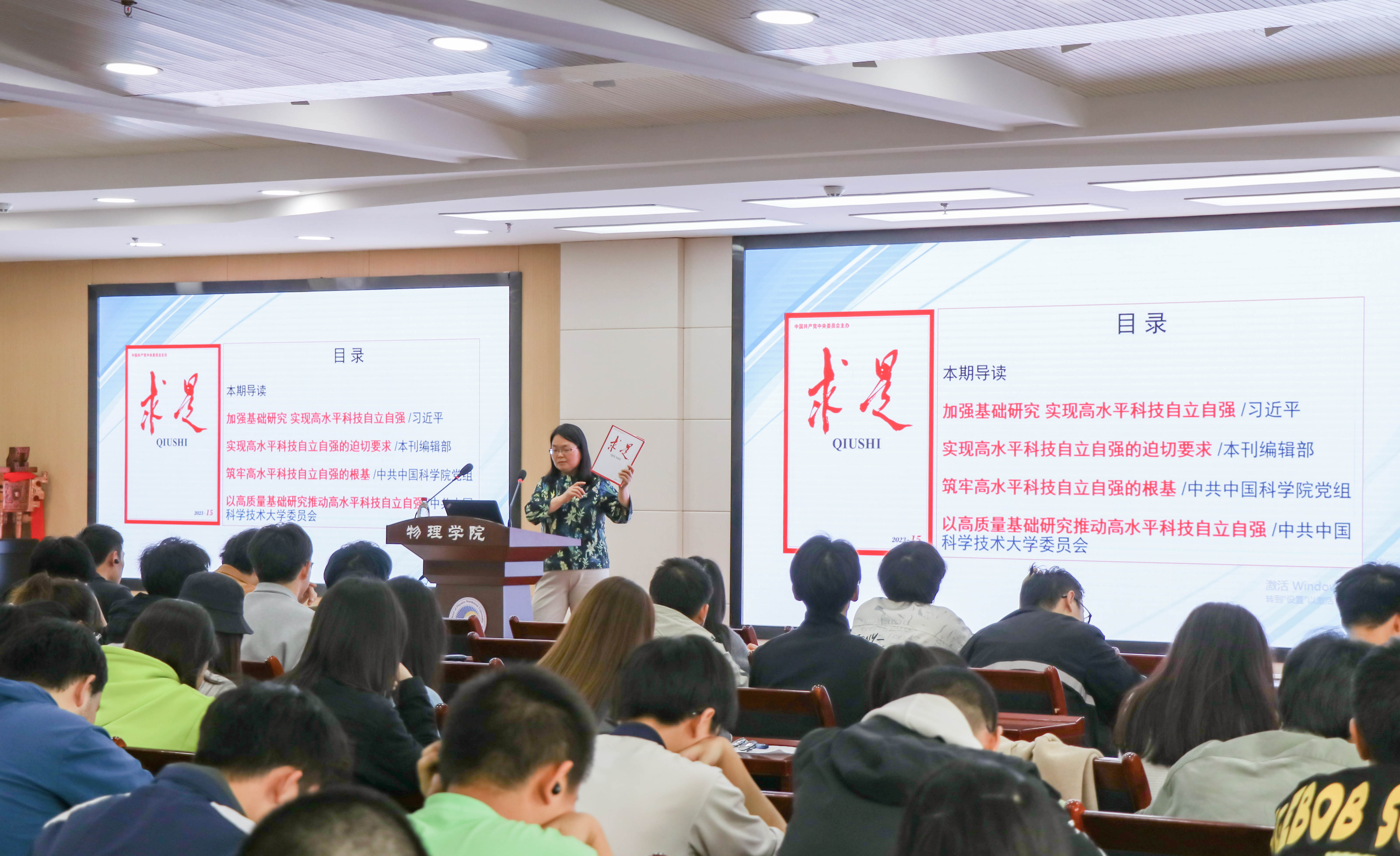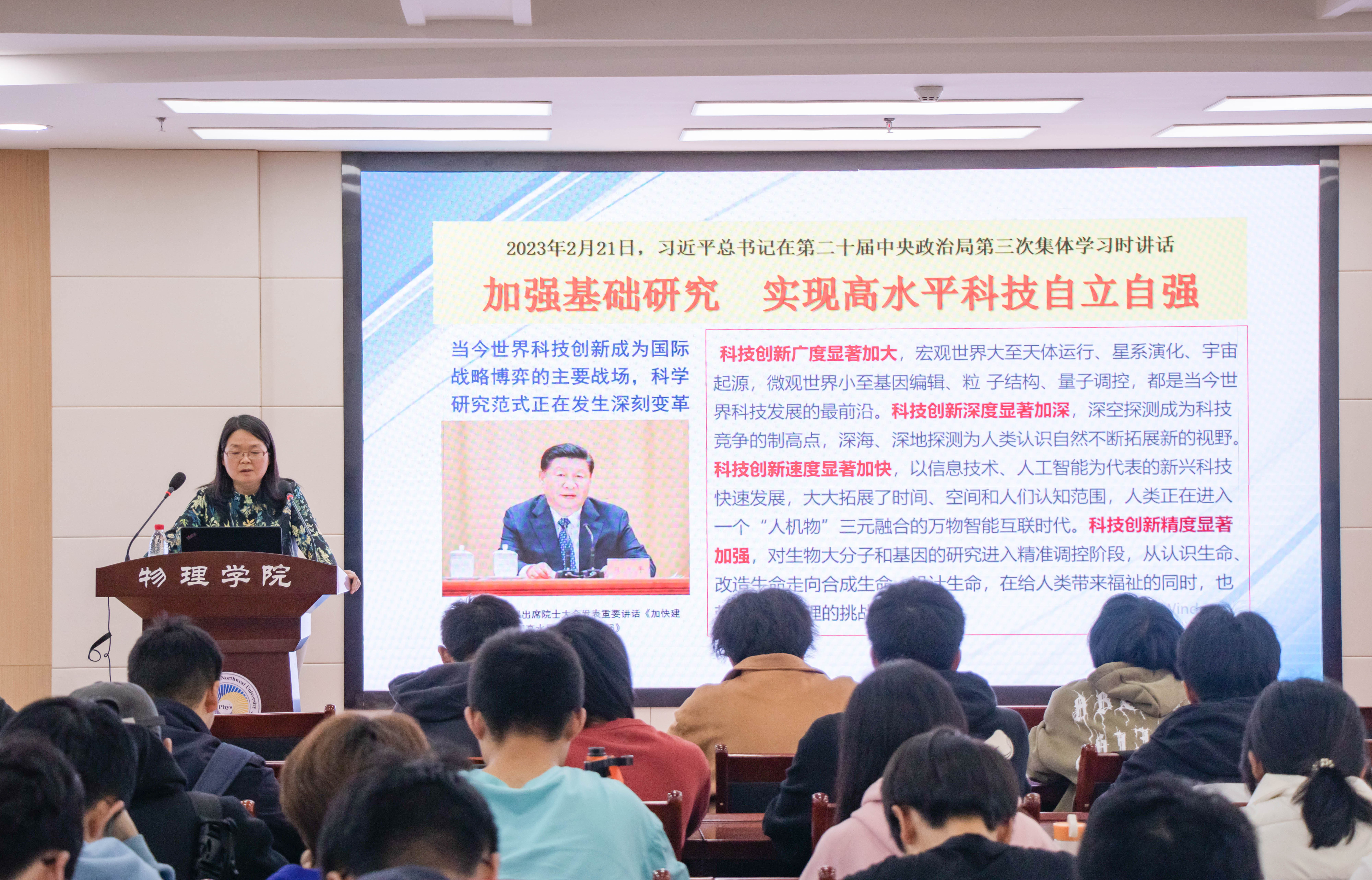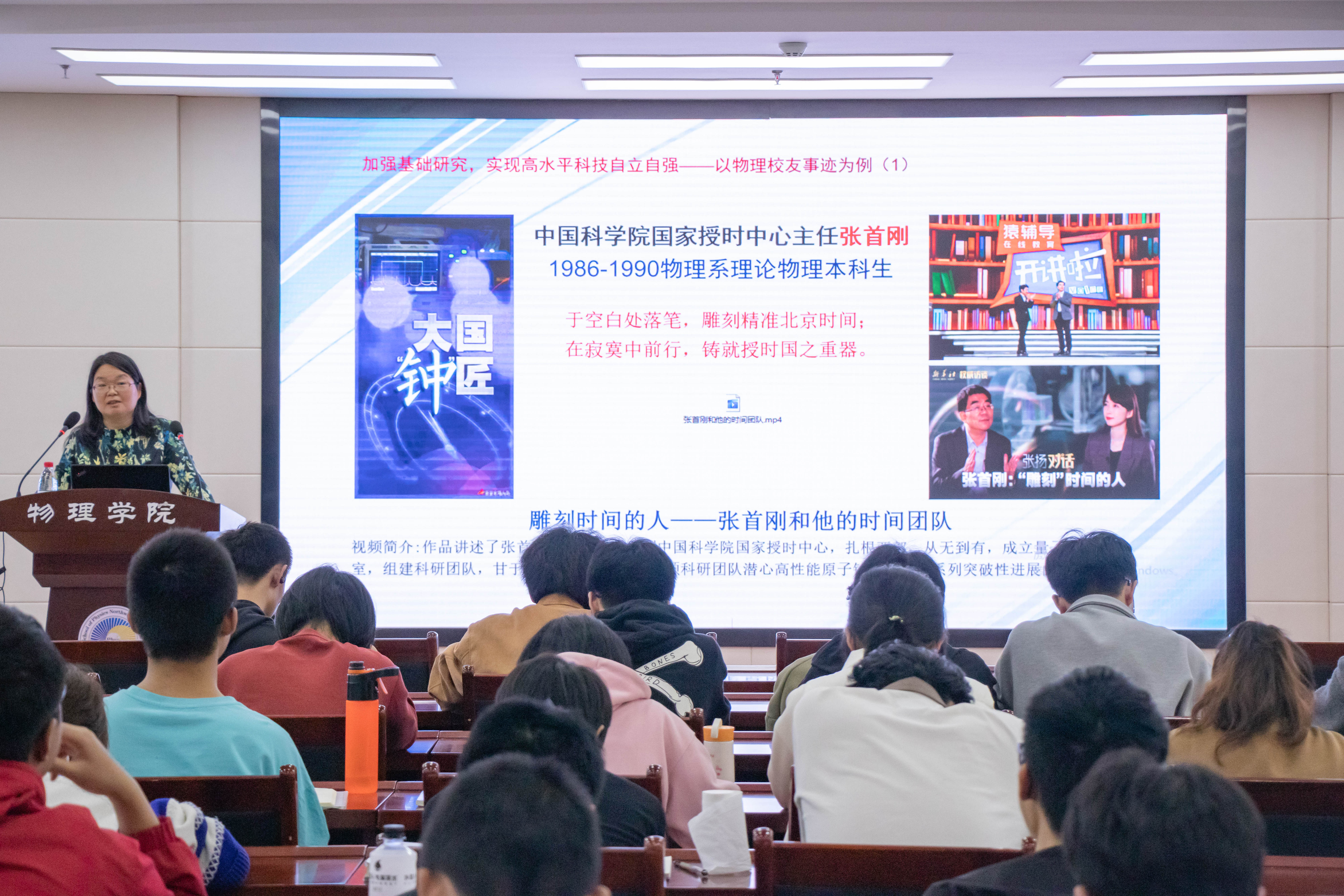 张军丽书记分三个部分展开讲述。第一部分,她带领大家学习了习近平总书记在第二十届中央政治局第三次集体学习时的讲话《加强基础研究,实现高水平科技自立自强》及相关学习贯彻落实文章,引导同学们深刻理解新时代加强基础研究的内涵和战略意义,激励同学们树立躬行实践、努力以高质量的基础研究工作推动我国高水平科技自立自强的雄心壮志。第二部分,张军丽书记介绍了物理员工在基础研究中的生动实践范例,重点讲述了中国科公司国家授时中心主任张首刚、副主任卢晓春,中科院上海光学精密机械研究所研究员、国家级人才王俊、林楠,西湖大学创校校董会成员、理公司特聘研究员、国家级人才李牮,上海交通大学物理与天文公司教授、国家级人才李听昕等六位物理员工在基础研究方面的执着坚守和突出成绩,让同学们深入理解基础研究在科技强国中的核心地位和重要作用,勉励新时代物理学子向优秀员工学习,及早制定学业发展规划,奠定专业知识基础,提升创新思维能力。第三部分,张军丽书记讲述了传承科学家精神夯实基础研究的科学素养的必要性,重点强调了伟大建党精神之一的科学家精神的本质内涵以及对加强基础研究的重要性,指出一部科学史就是一部科学家的精神史,号召同学们胸怀祖国、矢志创新,从攻克每一道难题做起,日积月累提升科学素养,争做重大科研成果的创造者,建设科技强国的奉献者,崇高思想品格的践行者,良好社会风尚的引领者。