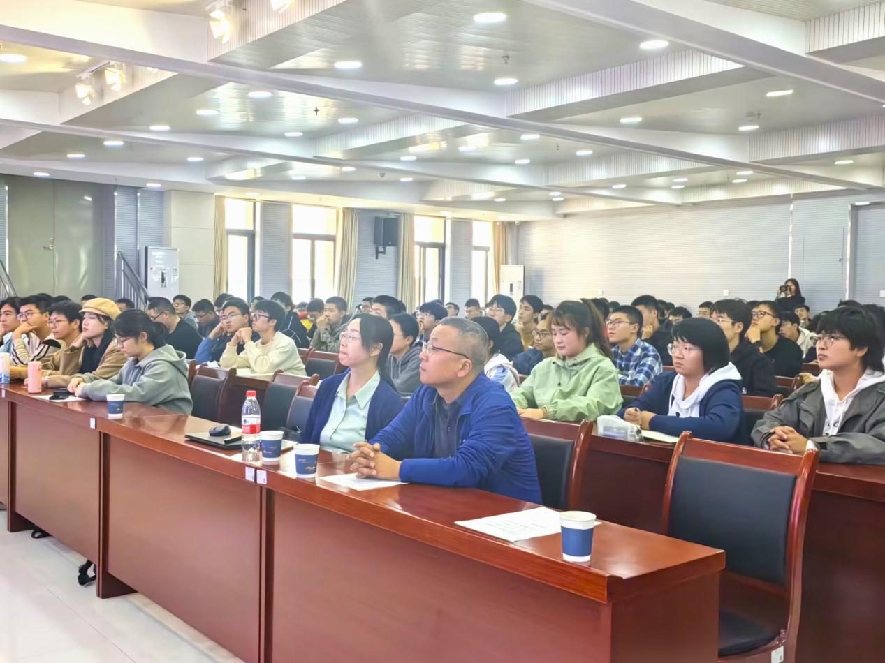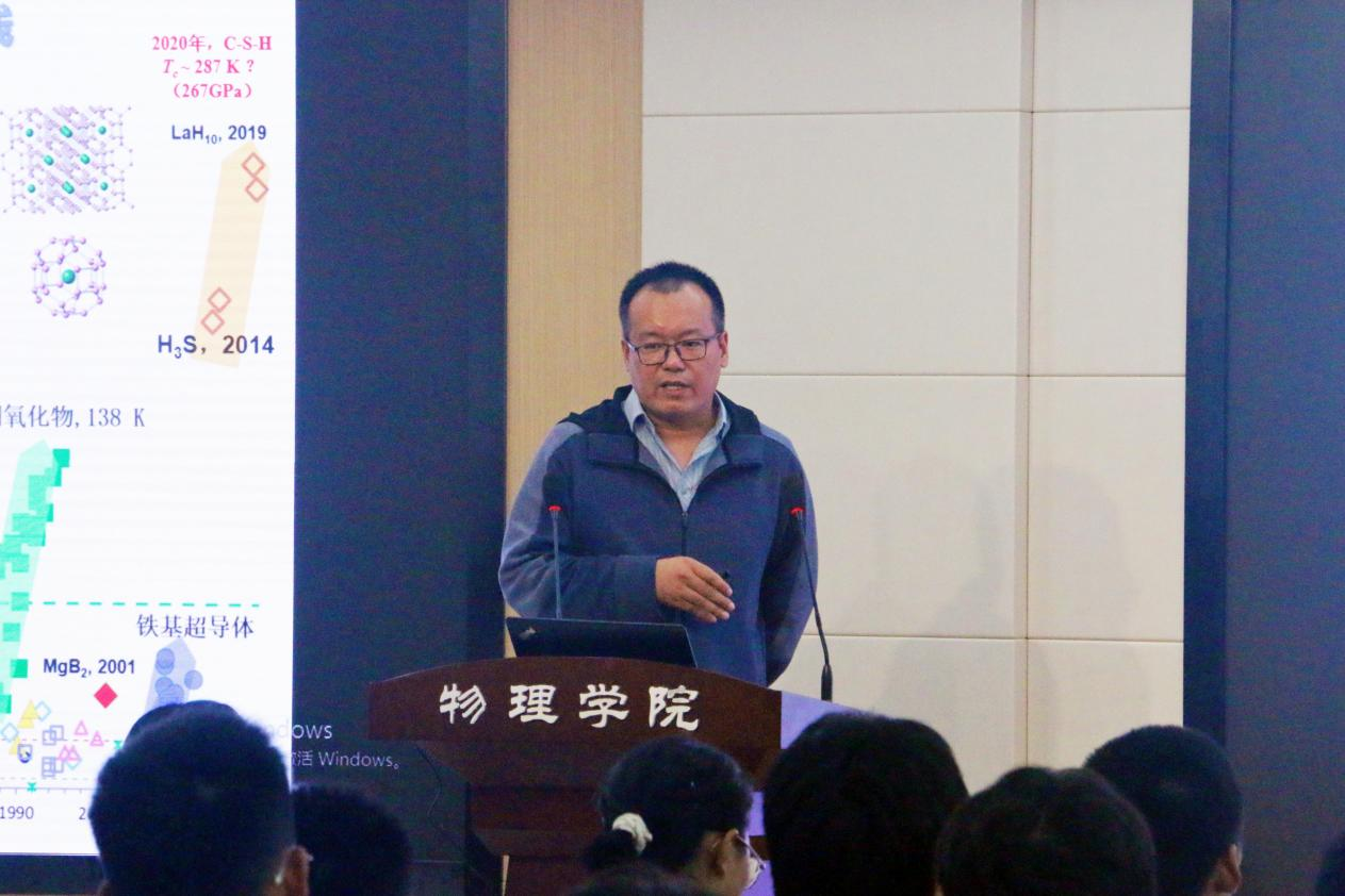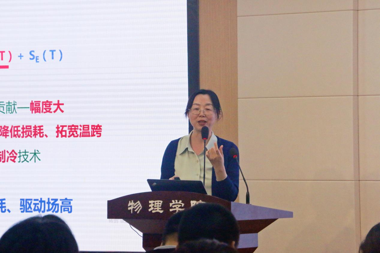 颁奖仪式结束后,学术讲座正式开始,王铂森副研究员首先作报告。他向大家介绍了怀柔综合极端条件实验装置(SECUF)的六面砧实验站建设,最后展示了近期以压力为手段在探索和调控超导新材料上的研究结果。随后,胡凤霞研究员展示了其团队针对磁性相变、自旋结构调控和相关功能特性(磁热效应、反常热膨胀、压磁效应等)开展的系列研究成果。精彩的报告赢得了阵阵掌声,两位老师与同学们进行了细致、详尽的交流。