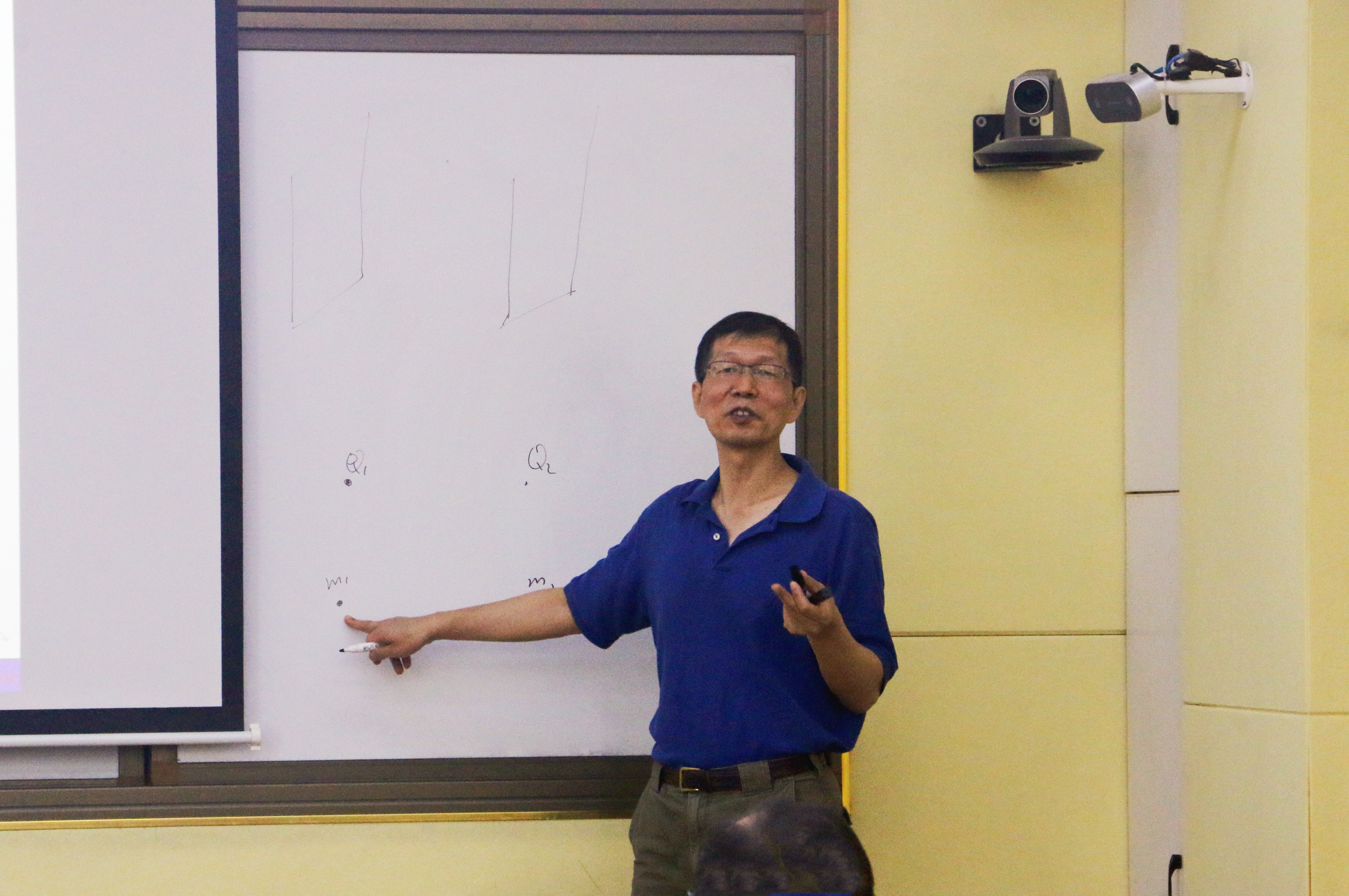卢建新教授首先介绍了超弦理论的自洽性要求时空是1+9维,而非生活中的1+3维世界。为检验该理论,通常需要将6个空间维度按Calabi Yau空间给予紧致化,以给出包含粒子物理标准模型的4维理论。类比于QED中著名的Schwinger对产生,卢建新教授考虑了一个由两个平行放置的II型弦理论中Dp膜系统的开弦对产生。当膜上携带背景电场时,该系统一般会给出正反开弦对的产生。最后,卢建新教授展示了该系统是如何产生开弦对,并解释了在背景电场之外加入磁场后的开弦对产生增强效应背后的物理机制。