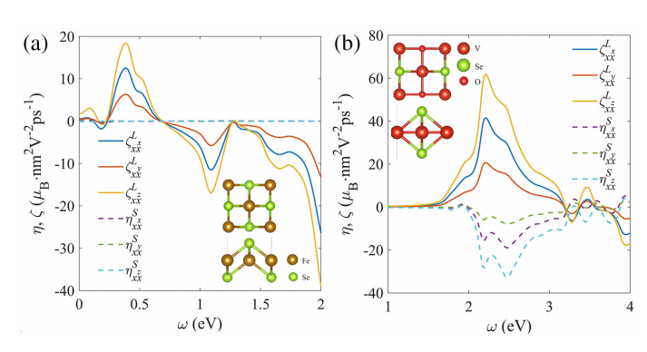 密度泛函理论可以进一步验证该理论。如图2所示,线偏振光在反铁磁单层FeSe(图2a)和交错磁V2Se2O单层(图2b)中皆诱导出有限大小的奈尔矢量扭转ζ,然而线偏振光在反铁磁单层FeSe(图2a)和交错磁V2Se2O单层(图2b)中诱导的自旋扭矩η分别为0和非0。因此可以作为区分反铁磁和交错磁的有效手段。