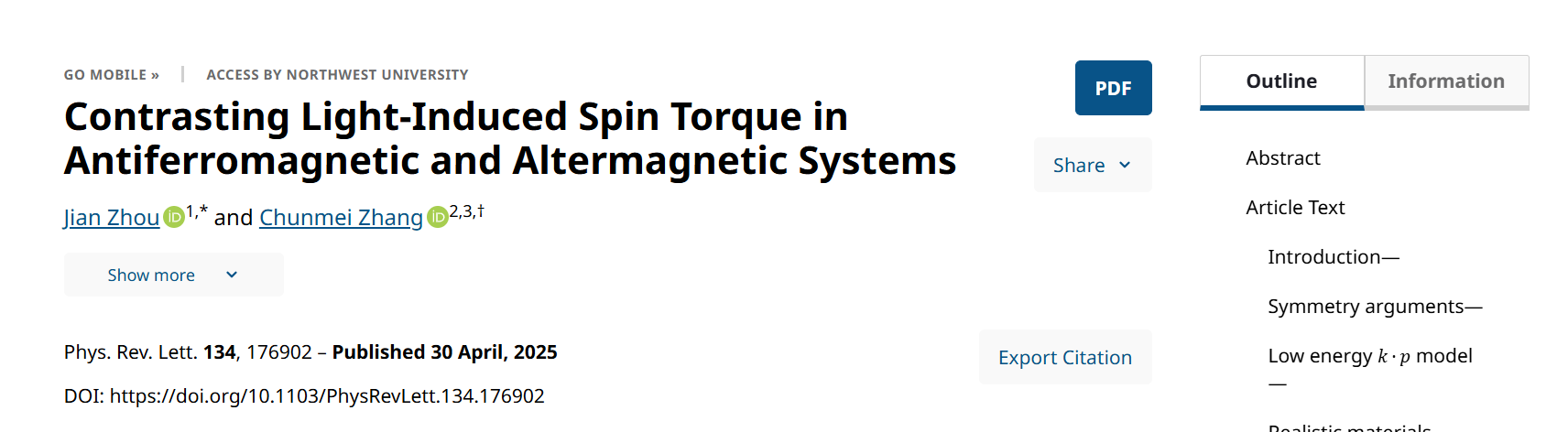 磁性材料在自旋电子学及其应用中占据重要的地位。除了传统的铁磁体系外,反铁磁体系由于其可以提供超快自旋动力学、更精确的调控方案、没有漏磁场、不易被外磁场所干扰等特性,近年来获得了凝聚态物理和材料物理领域广泛的关注。然而由于反铁磁体系没有净磁矩,如何有效探测和调控其序参量——奈尔矢量——是反铁磁自旋电子学中重要的科学问题之一。另一方面,为了互补反铁磁和铁磁的各自优势,近年来人们提出了另一类非常规反铁磁体——交错磁体。与常规反铁磁体不同的是,它具有非相对论性自旋劈裂,从而在输运特征上可以展现新的行为。然而,这些输运行为并非交错磁体的充分条件。因此,如何探索新的探测和调控手段,例如从自旋电子学方面区分常规反铁磁和交错磁体,是凝聚态物理中另一个尚未解决的前沿课题。