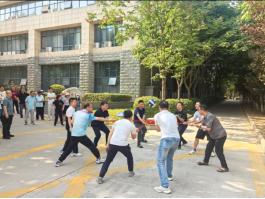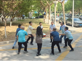 同心击鼓活动,是今年公司运动会的新设置的比赛项目之一。所谓同心击鼓即每支参赛队伍的八位队员需要分别站在八个方位上,各自手握一根系于鼓上的绳,然后合力操控鼓面上下移动以将鼓上的气排球颠起。在此过程中,需要8位队员协力配合、及时移动,确保鼓面击球时的稳定性和准确性。该活动能够在有效激发团队协作意识的同时,又不失趣味性,在提升团队凝聚力和向心力、营造积极向上和谐融洽的工作氛围发挥了积极作用。