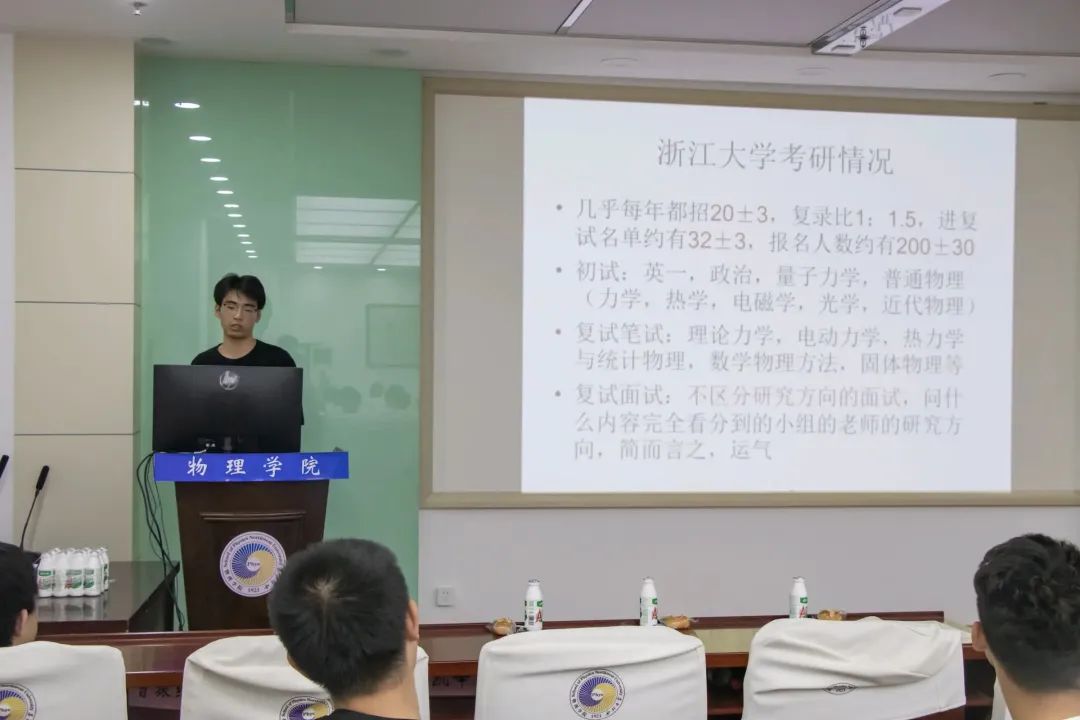 第一位是考研至浙江大学物理学专业的王文正学长。王文正学长结合自身考研经历,围绕同学们特别关心的问题做出回答。首先,他介绍了浙江大学物理学专业的考研情况、并展示了该专业的考纲。随后,针对量子力学、普通物理、英语、政治等主要科目,他结合个人经历和心得体会,总结并分享了一套具有普适性的高效备考方法。最后,学长着重强调考研之路细节与心态并重,唯有注重细节、保持良好心态,方能在激烈竞争中脱颖而出,实现理想抱负。