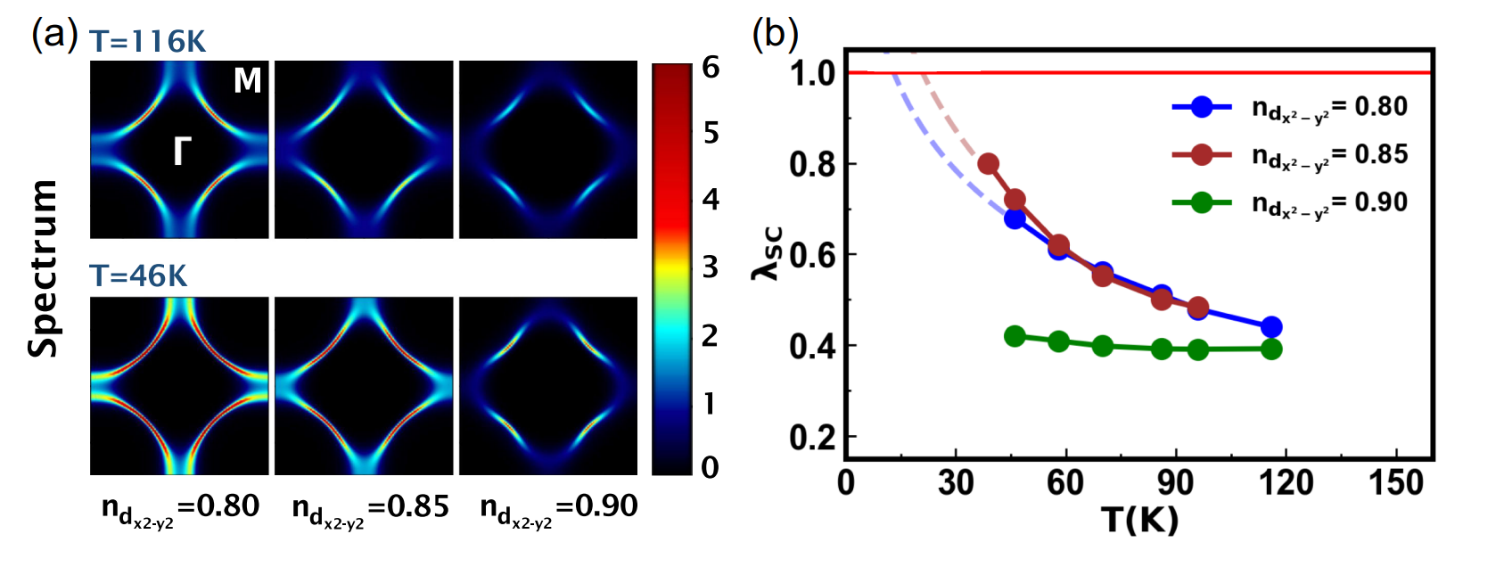 图:(a)DΓA理论方法计算得到的不同温度和不同空穴掺杂下的费米面结构;(b)不同空穴浓度以及不同温度下的超导本征值,理论计算显示在n=0.80和0.85下,体系分别具有13K和20K的超导临界温度。