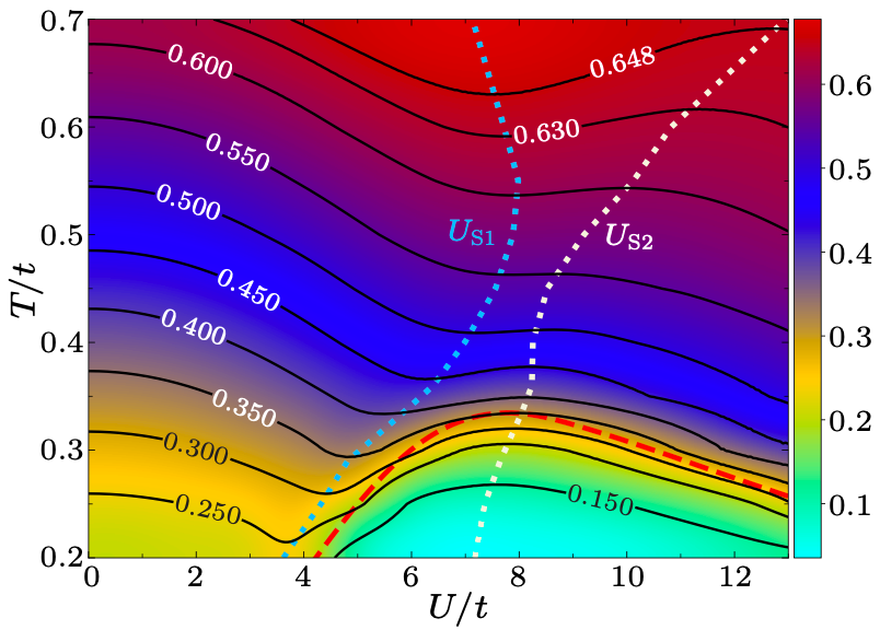 图1: 三维哈伯德模型在半满填充下、U-T平面上的熵相图。黑色线条为等熵线,相应数字为熵密度的数值。
