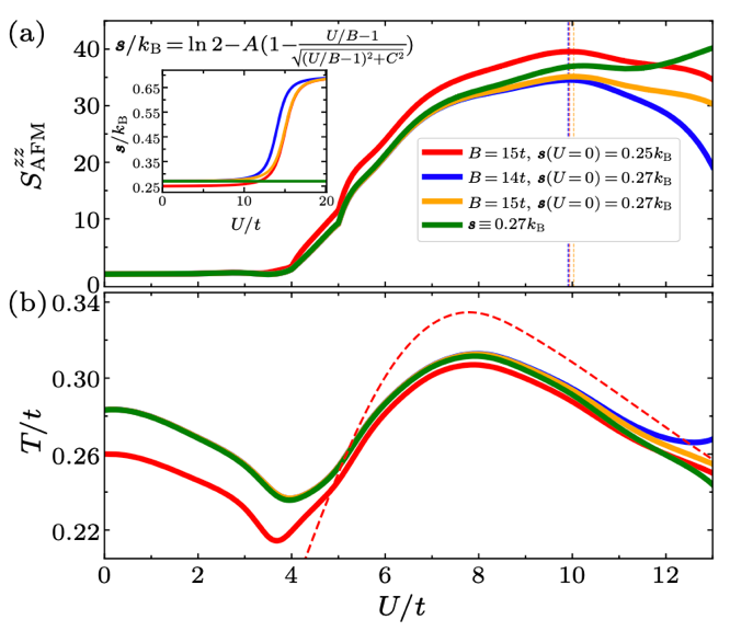 为系统考虑热力学熵增效应,研究团队首先计算了三维哈伯德模型在半满填充下的完整熵相图(图1),并解释了U-T平面上(T为体系的温度)等熵线的非单调行为及其背后的物理机制。在此基础上,随着相互作用强度U的增强,研究团队在熵相图上选取一些最有可能与实际光晶格实验相符的熵增路径,并计算这些路径上的反铁磁结构因子。研究团队发现,在研究团队选取的熵增路径上,反铁磁结构因子在U/t~10附近达到最大值(图2),显著大于之前固定温度的计算结果(U/t=8.0~8.5附近)。