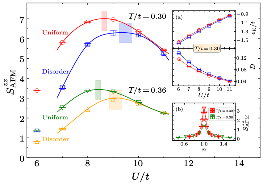 此外,研究团队通过在模拟中加入高斯型的局域电荷密度无序,对比了均匀体系与无序体系的计算结果,发现反铁磁结构因子的峰值位置确实向更大的U值偏移(图3);且随着无序性越强和温度降低,偏移量越大。在高斯型无序的标准差等于跃迁参数时,峰值位置右移约为1t。