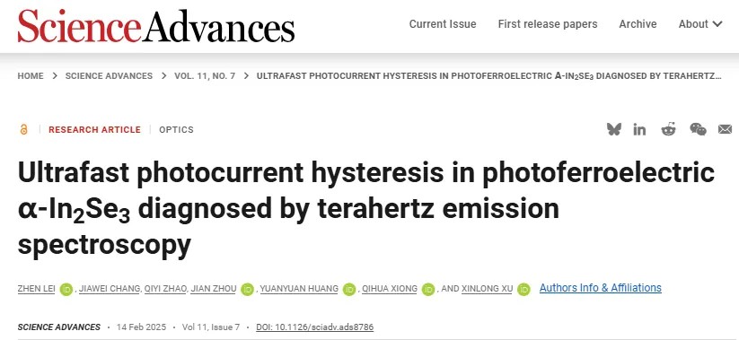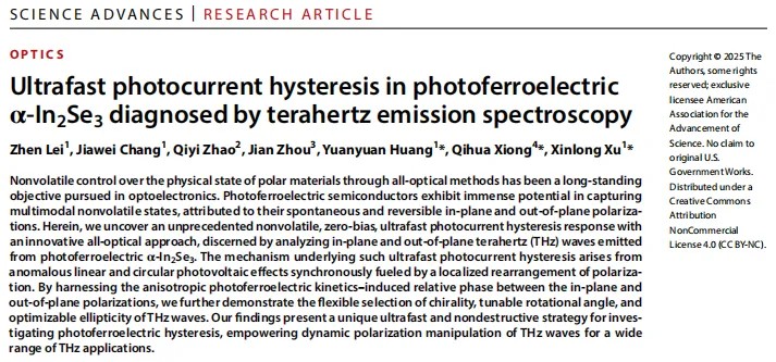 该研究成果以“Ultrafast photocurrent hysteresis in photoferroelectric α-In2Se3 diagnosed by terahertz emission spectroscopy”为题,发表在Science Advances上,雷珍博士为论文第一作者,黄媛媛副教授、熊启华教授(清华大学)、徐新龙教授为共同通讯作者。西安交通大学周健教授在理论分析方面提供重要帮助,公司毕业研究生常佳伟和西安邮电大学赵奇一博士也在研究过程中做出重要贡献。本研究工作受到国家自然科学基金等基金项目的支持。