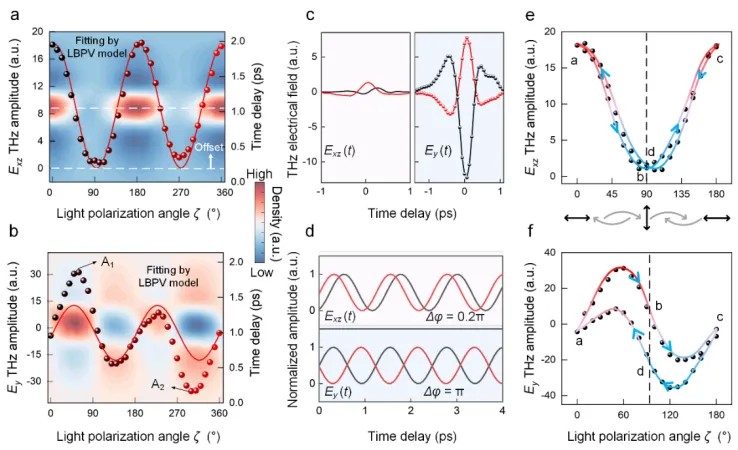 线偏振光驱动的非易失性移位光电流(shift current):通过调控飞秒光的偏振方向,团队发现面内和面间太赫兹信号呈现非同步偏振响应(图2a-b)。进一步分析显示,同一偏振光场会引起太赫兹波相位延迟,甚至发生极性反转,表现出明显的光铁电迟滞现象(hysteresis)(图2c-d)。这一反常的光致延迟/开关现象主要源于面内与面间铁电极化非易失性。为直观表征这种光致铁电极化记忆效应,团队构建了基于泵浦光偏振角(0°→90°→180°→90°→0°)的铁电回线测量模式。其中,Exz(t)呈现出蝶型电滞回线(图2e),Ey(t)则呈现出环型电滞回线(图2f),这种多维度极化记忆特性为光控铁电存储器设计提供了新思路。