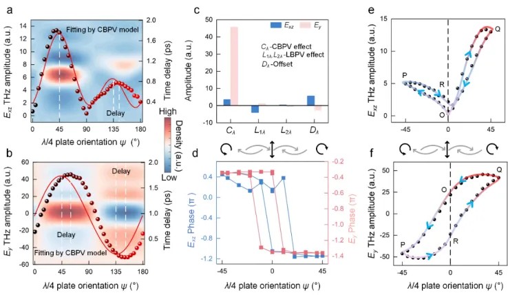 圆偏振光诱导的非易失性注入光电流(injection current):通过四分之一波片调控飞秒光的椭圆偏振态,α-In2Se3的太赫兹响应呈现明显延迟特征(图3a-b)。进一步研究发现,太赫兹波相位随着泵浦光偏振态的变化(0°→45°→0°→-45°→0°),呈现出环形电滞回线(图3c-d)。其中,太赫兹振幅铁电回线形态因极化方向差异呈现“蝶型”(面外)与“S型”(面内)(图3e-f)。以上研究表明,α-In2Se3在零偏压下的超快光电流滞后源于异常的线偏振和圆偏振光生电流效应,由极化状态的局部重排驱动。