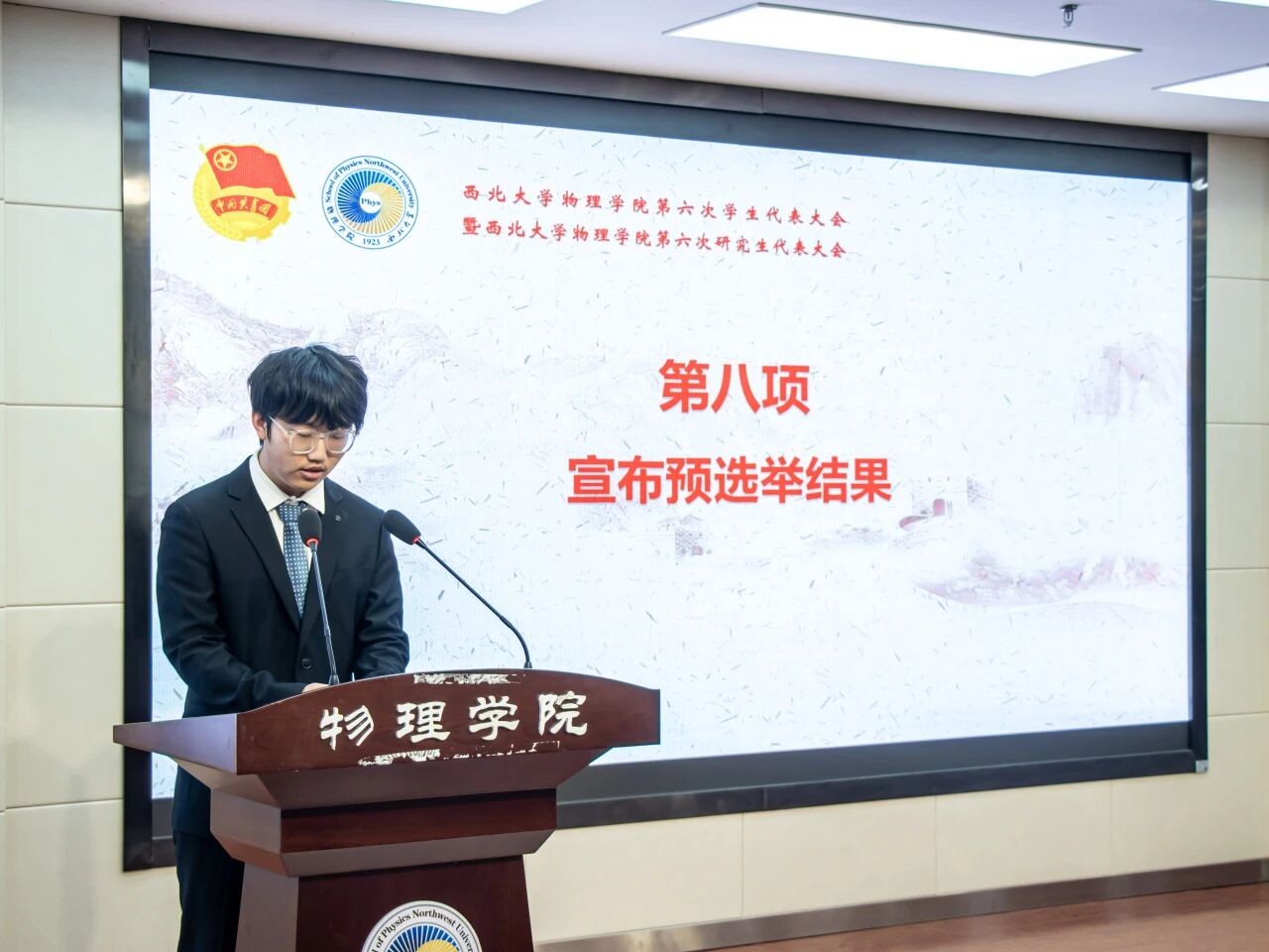 付眙菲同学受筹备工作委员会委托,向大会作《代表资格审查报告》,尹志豪同学宣读了大会主席团、秘书长及副秘书长名单并审议通过。大会审议还通过了正式会议议程、大会选举办法和大会总监票人、监票人、总计票人、计票人名单。