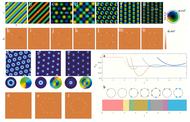 研究团队发现,在里德伯缀饰与自旋-轨道耦合的共同作用下,量子流体中可以“生长”出丰富多样的拓扑结构。这一切由一个关键的无量纲数 ξ 决定。随着 ξ 的变化,原子会分别占据动量空间中的不同点位,从而在实空间中形成具有不同旋转对称性的涡旋晶格。当 ξ 足够大、里德伯相互作用足够强时,系统中会产生由径向量子数表征的特殊高阶涡旋,这种结构此前只在光学系统中被观测到。