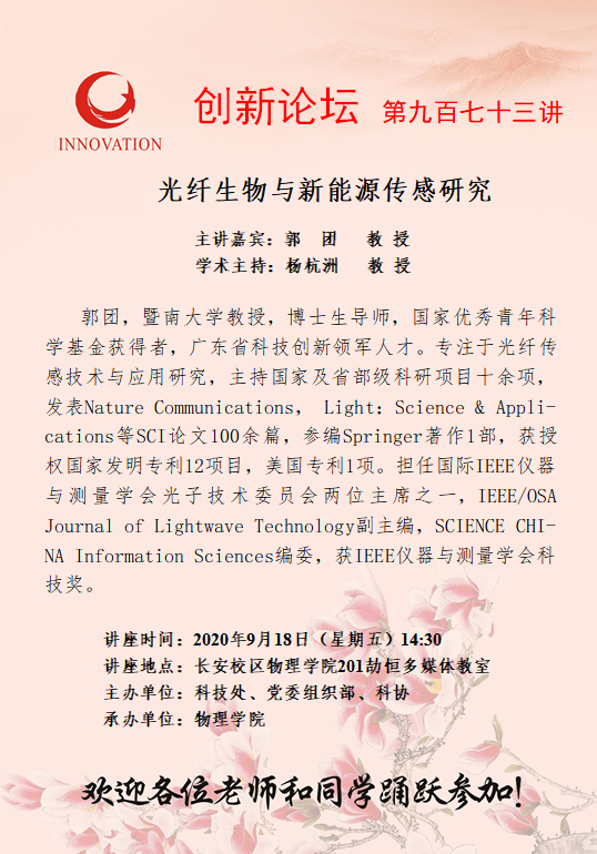 创新论坛第九百七十三讲通知——光纤生物与新能源传感研究