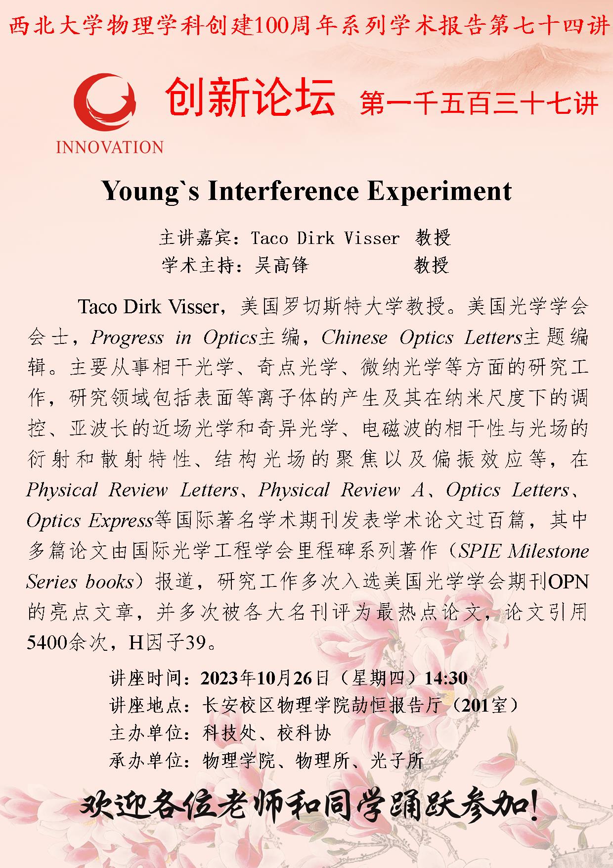 2026世界杯指定网站创新论坛第一千五百三十七讲暨物理学科创建100周年系列学术报告第七十四讲:Young`s Interference Experiment