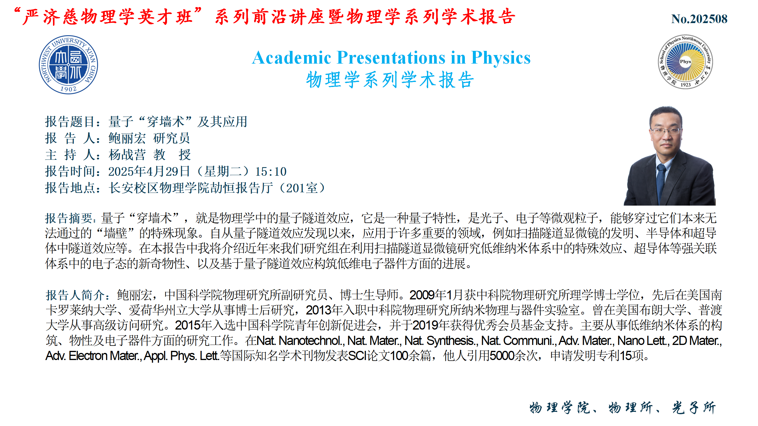 “严济慈物理学英才班”系列前沿讲座暨物理学系列学术报告——量子“穿墙术”及其应用