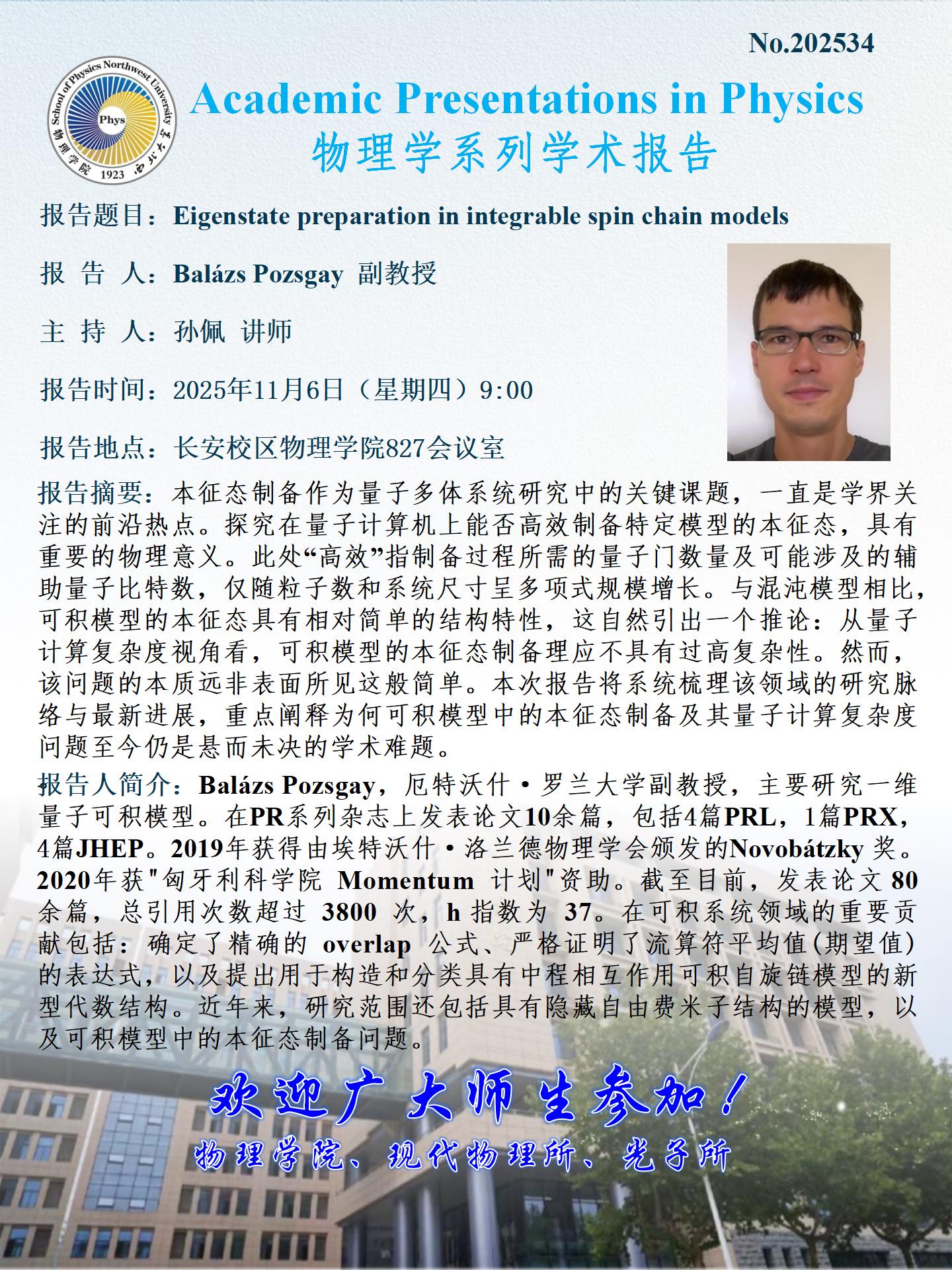 学术报告——Eigenstate preparation in integrable spin chain models